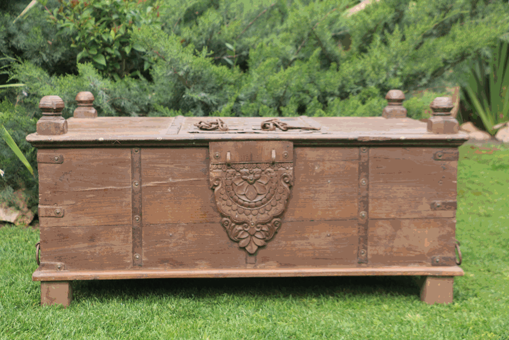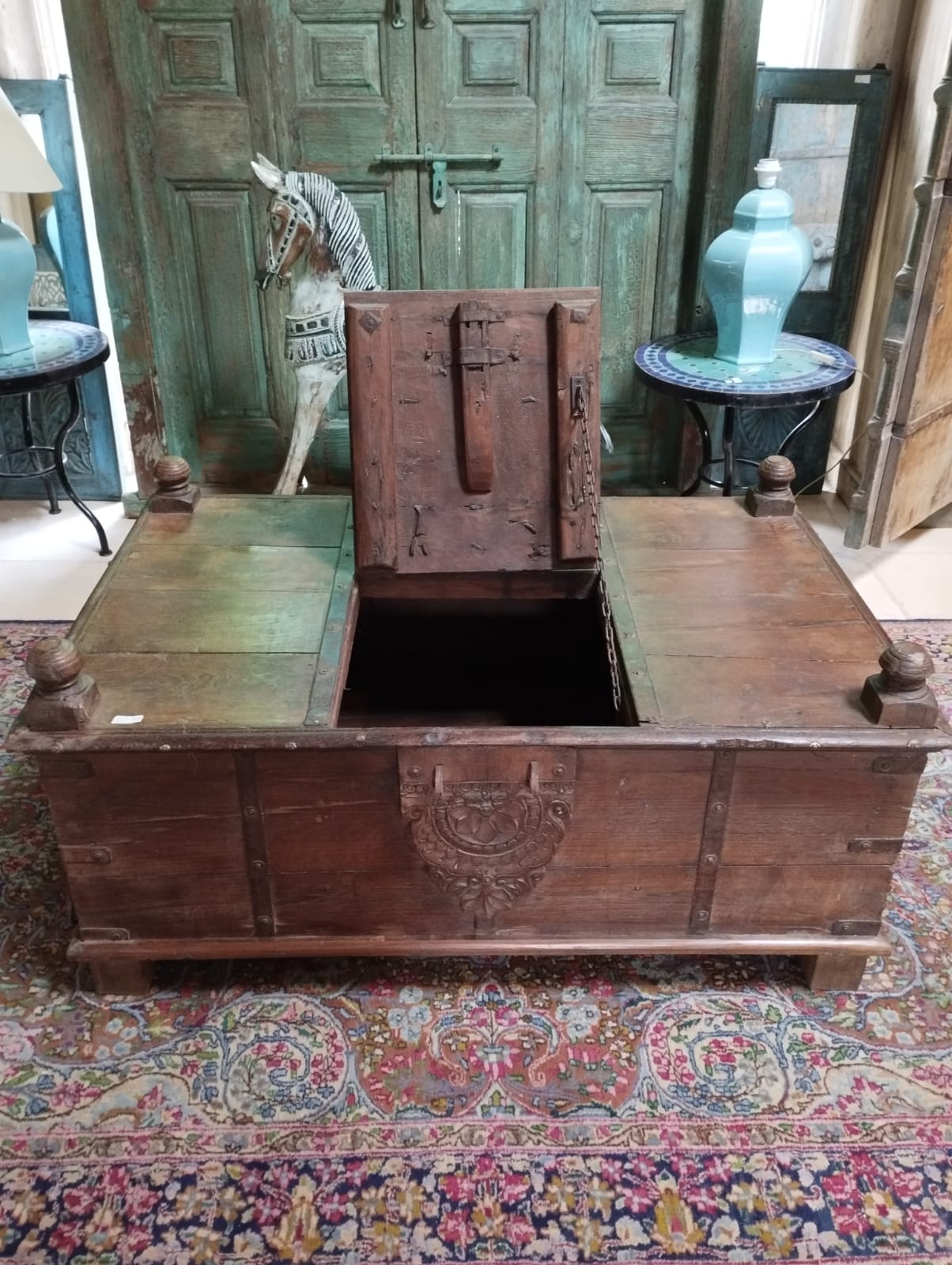 Cassapanca indiana antica in legno di teak con un fregio nella parte frontale, piccola apertura dall’alto e catenella in ferro