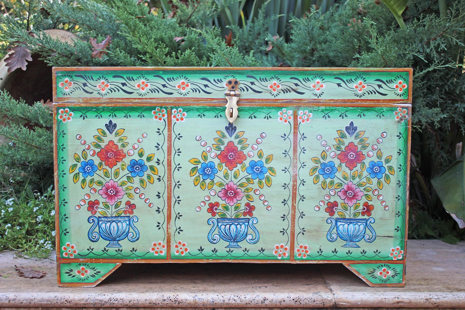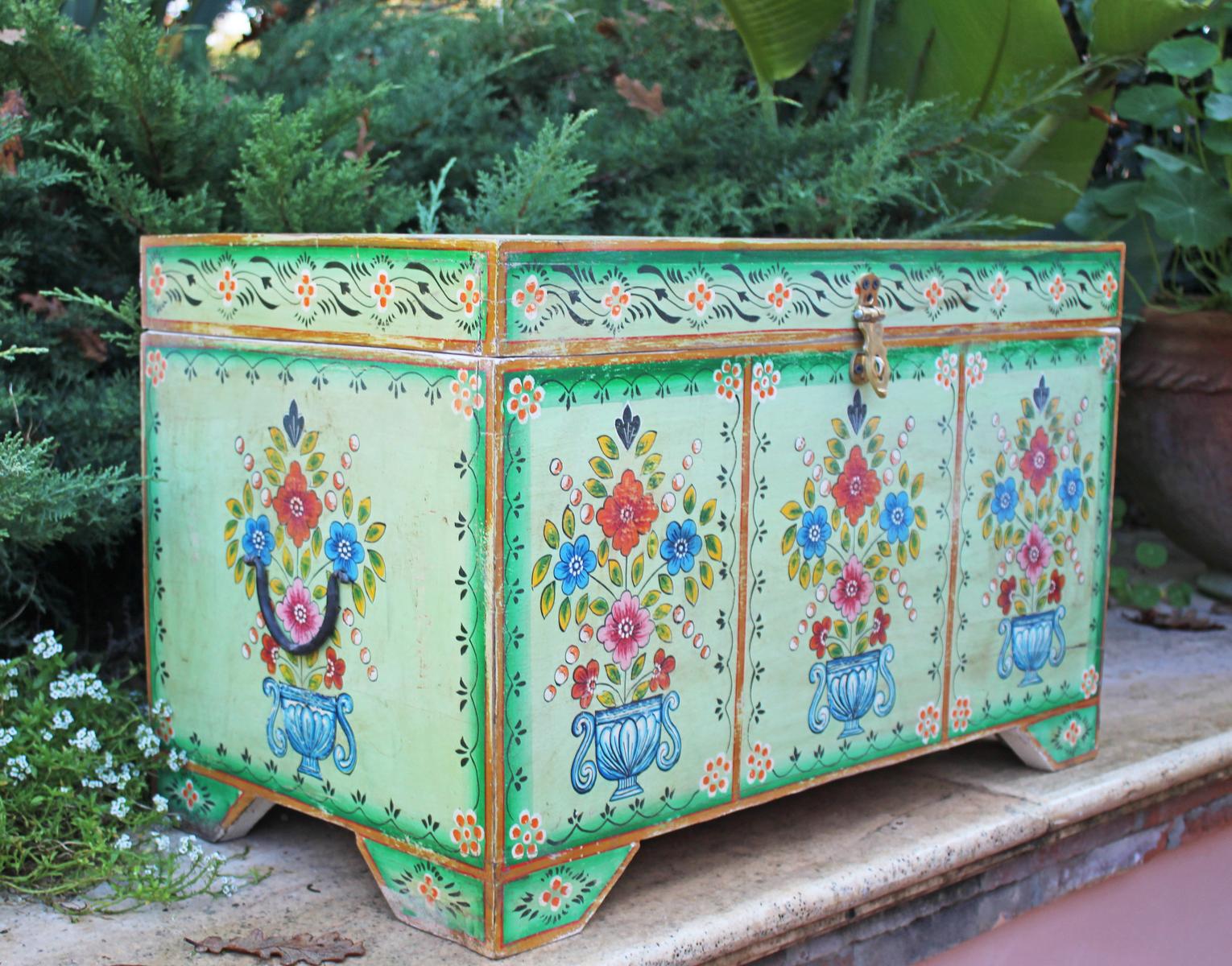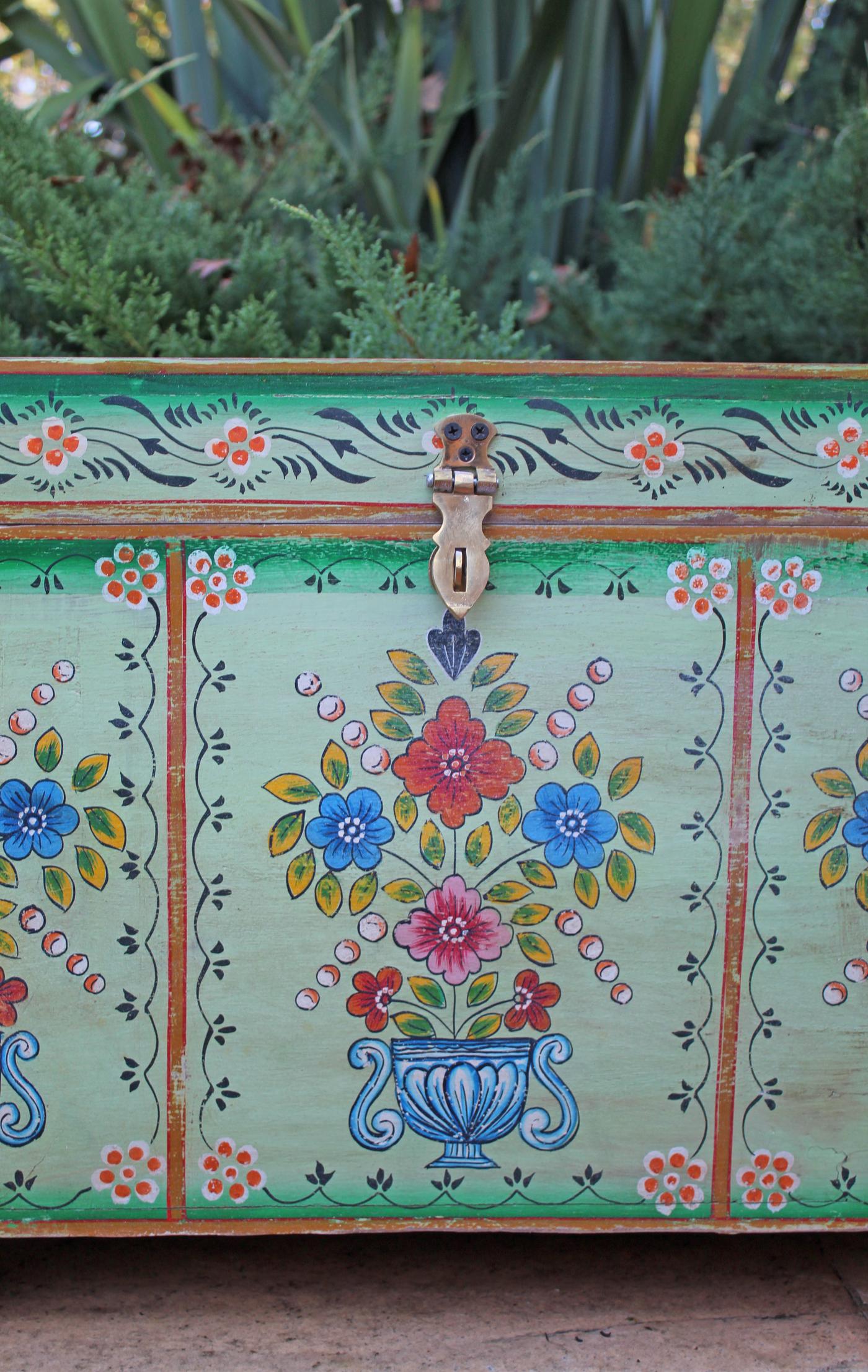 I motivi decorativi, curati nei minimi dettagli, creano composizioni simmetriche ed eleganti che donano alla cassapanca un forte impatto estetico e un’anima esotica.