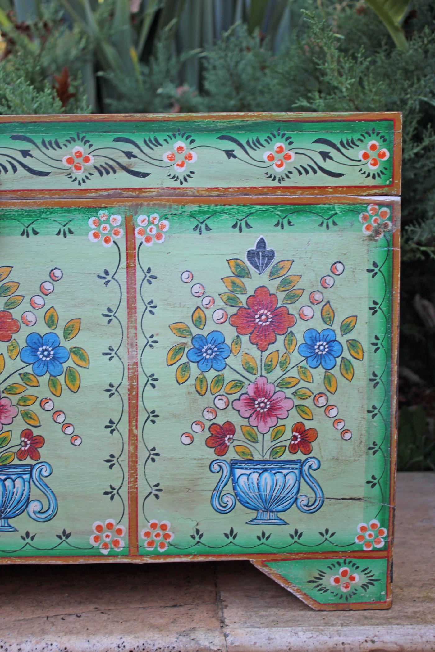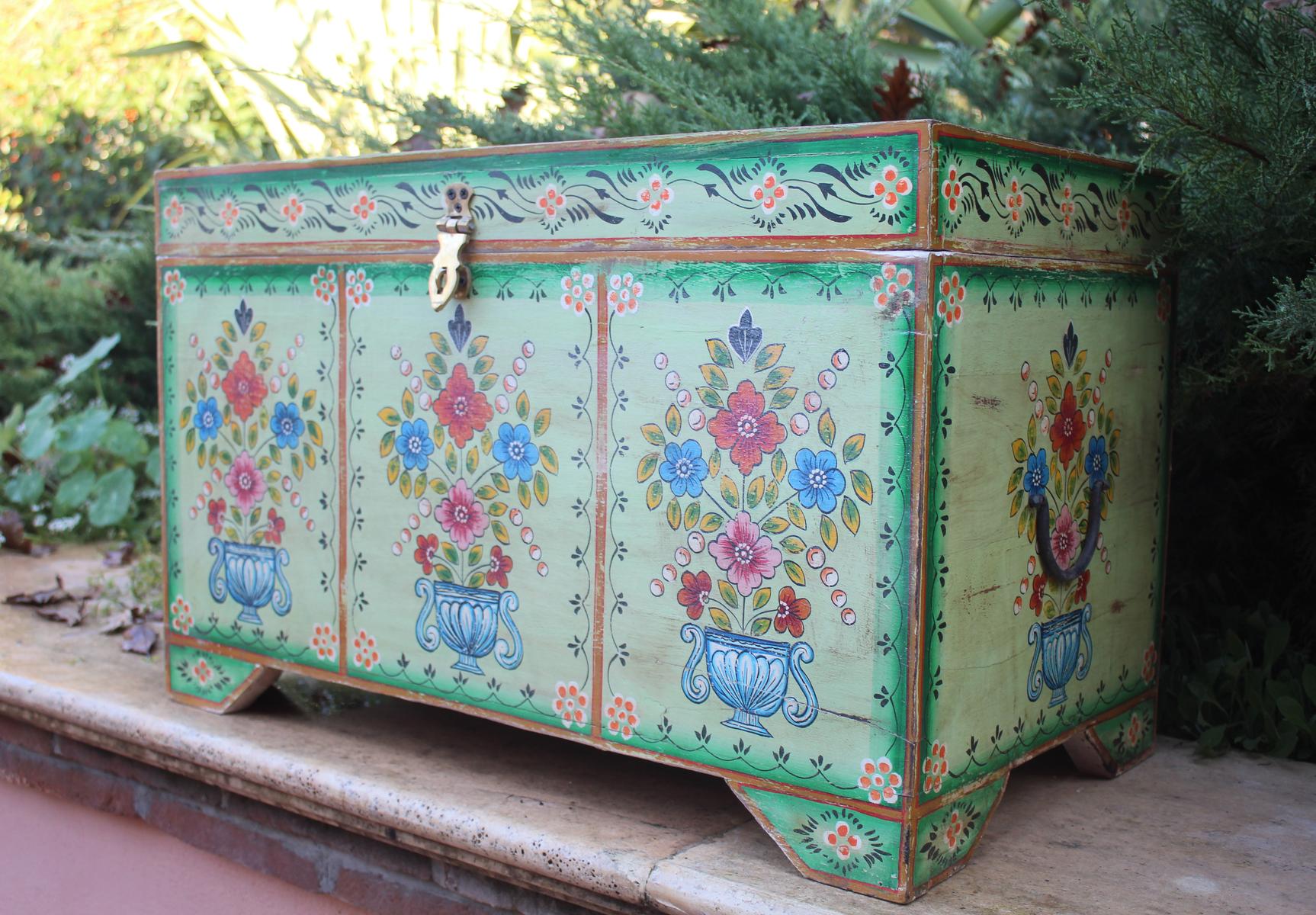 Costruita interamente in legno, è completamente dipinta a mano su una delicata base verde chiaro, arricchita da raffinati disegni floreali dai colori vivaci ed armoniosi.