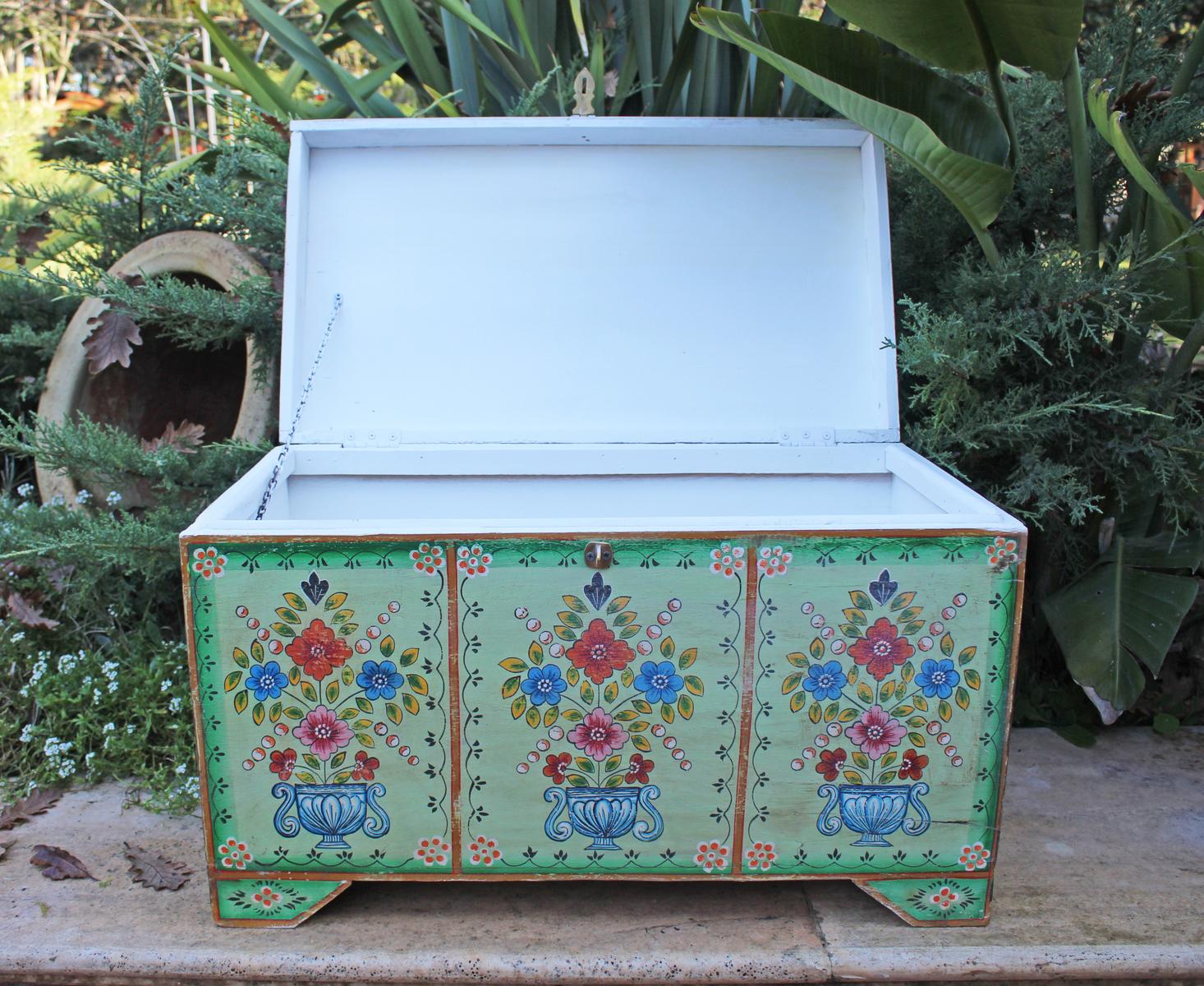 Il retro e l’interno della cassapanca sono lasciati bianchi, una scelta che esalta il contrasto con le decorazioni esterne e dona luminosità.