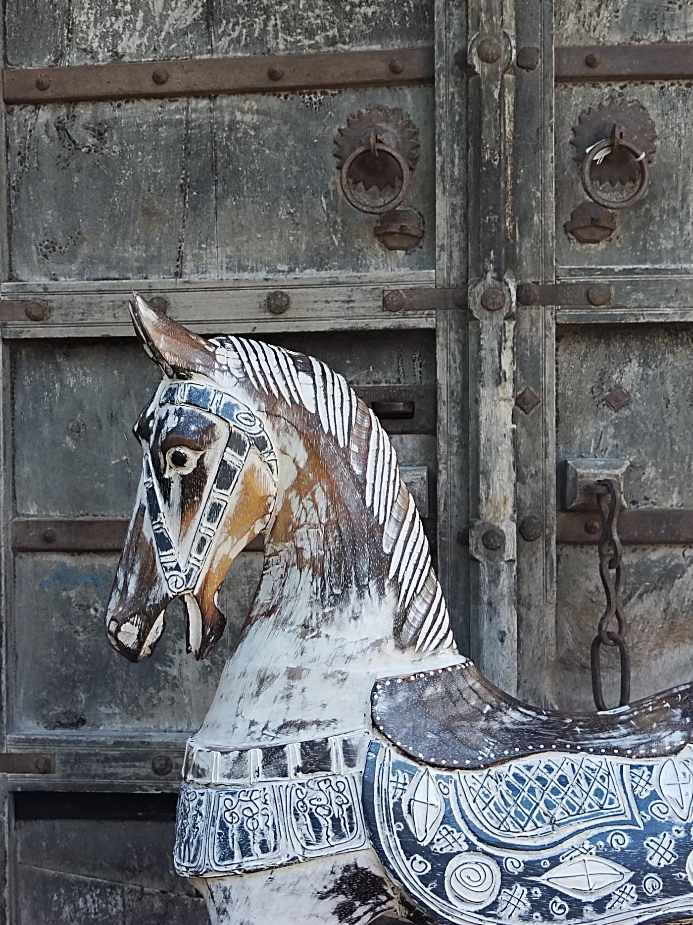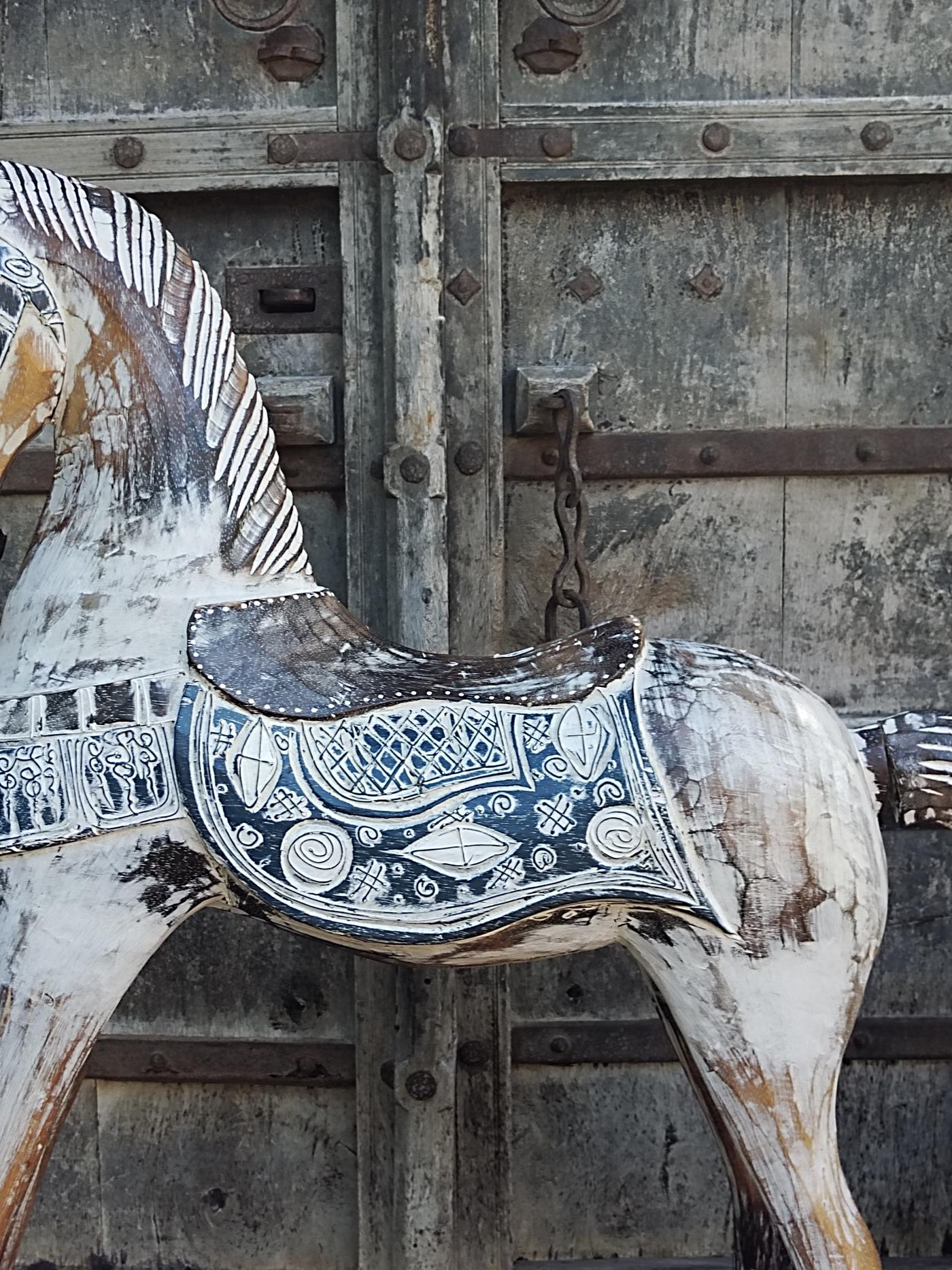Cavallo indonesiano in legno, realizzato artigianalmente, in legno decapato bianco con sella blu