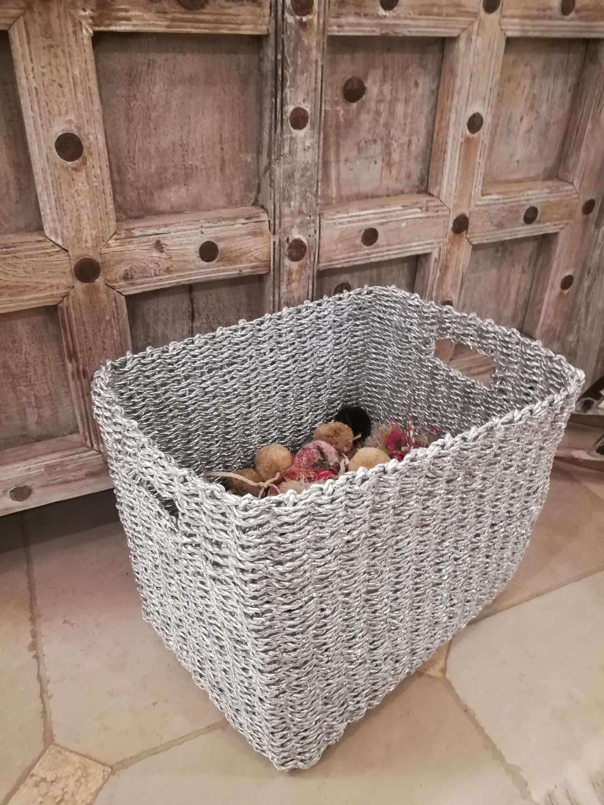 Cesta indonesiana rigida rettangolare di colore argentato con maniglie ai lati