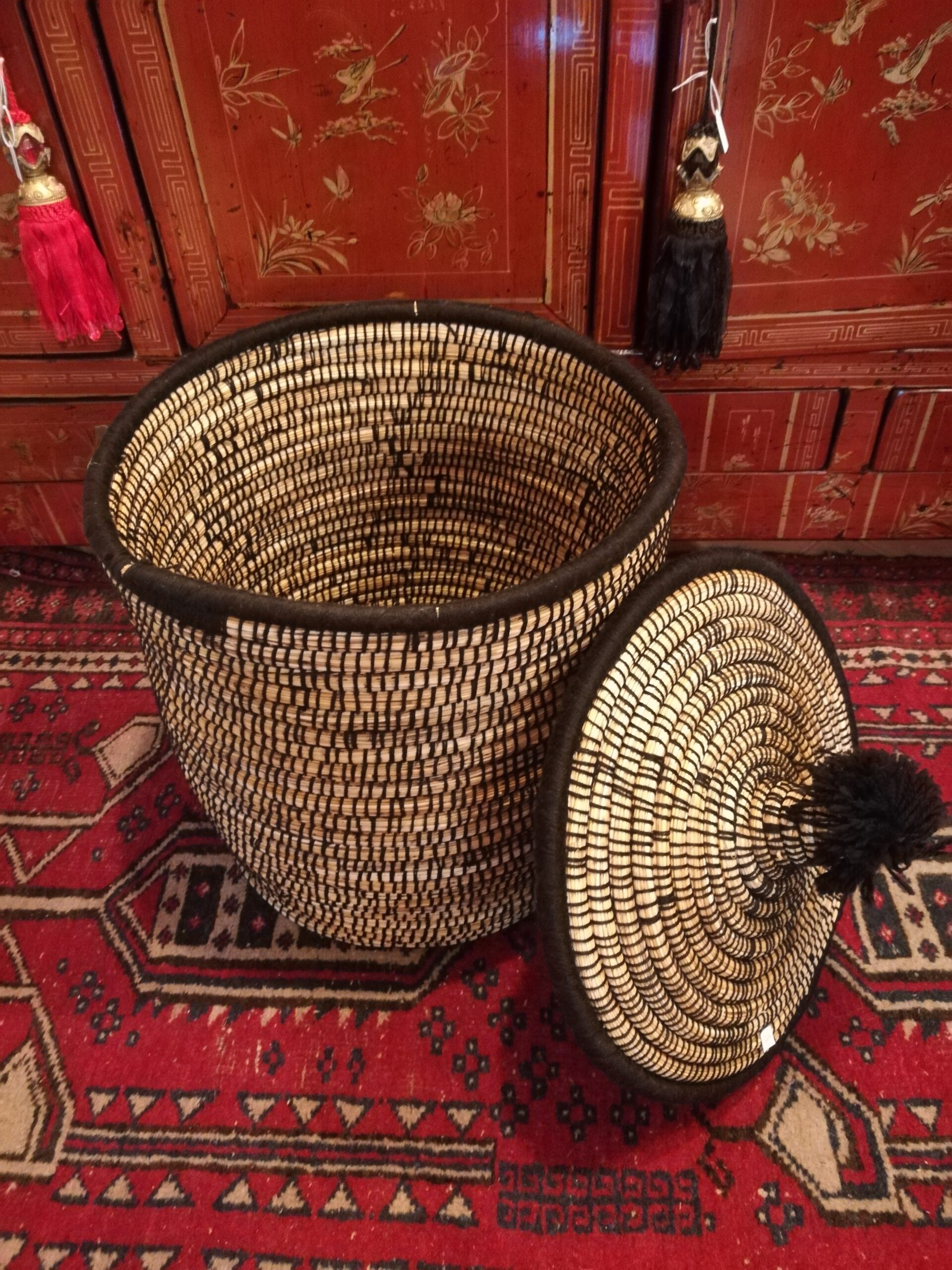 Cesta marocchina, con coperchio, in paglia rigida rifinita cotone nero