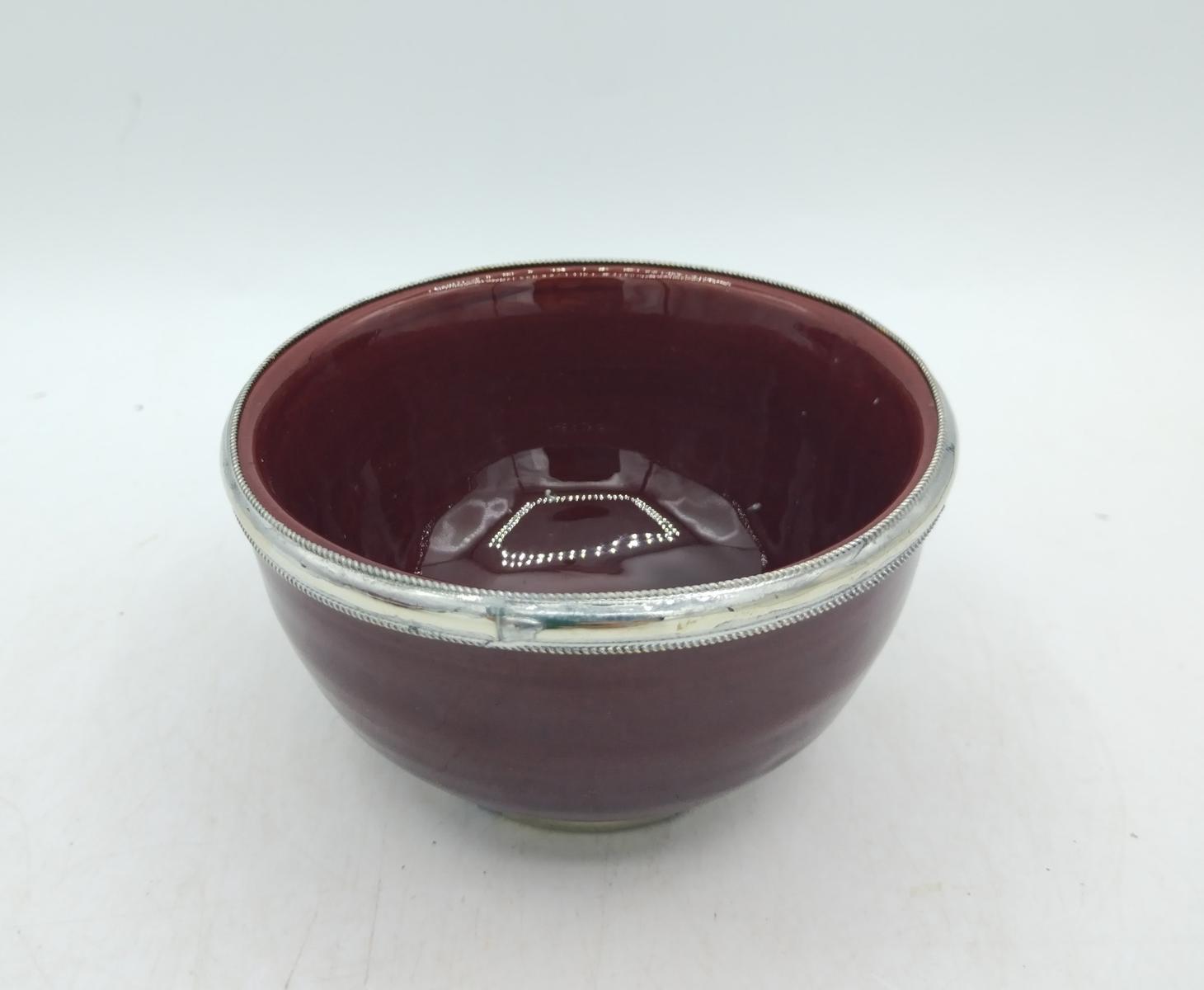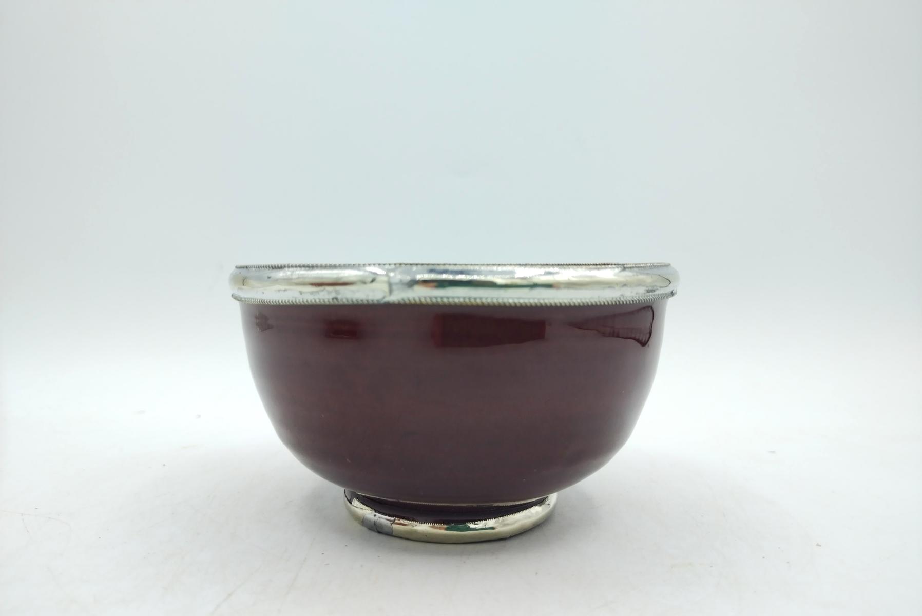 Ciotola smaltata marocchina in terracotta bordeaux con il bordo e la base rifiniti in argentone
