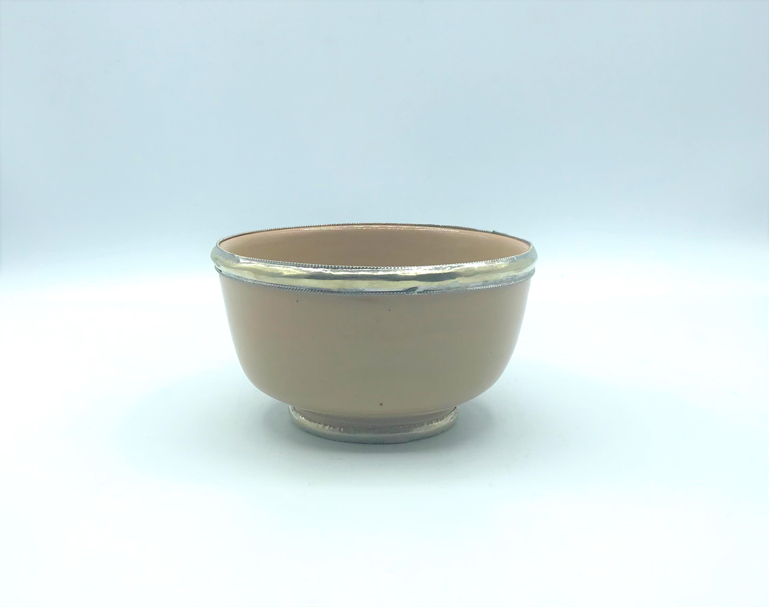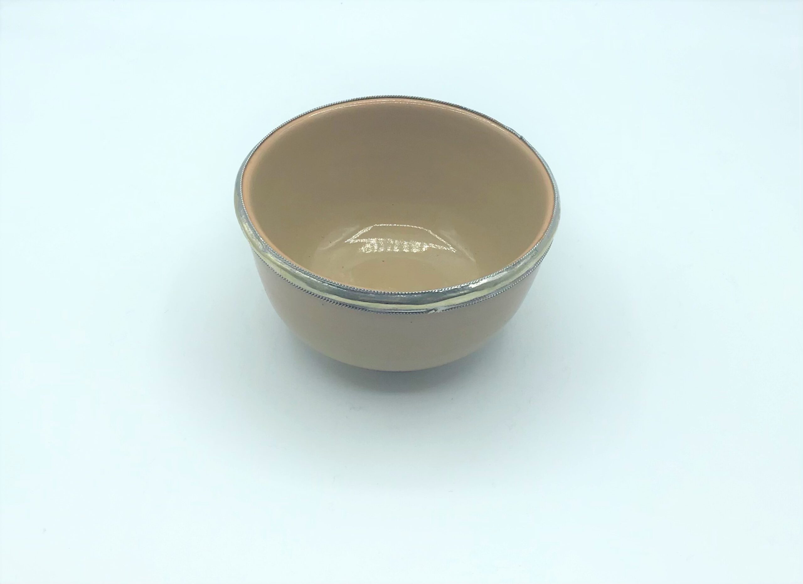 Ciotola in terracotta ecru con il bordo e la base rifiniti con l’ argentone; realizzate in Marocco