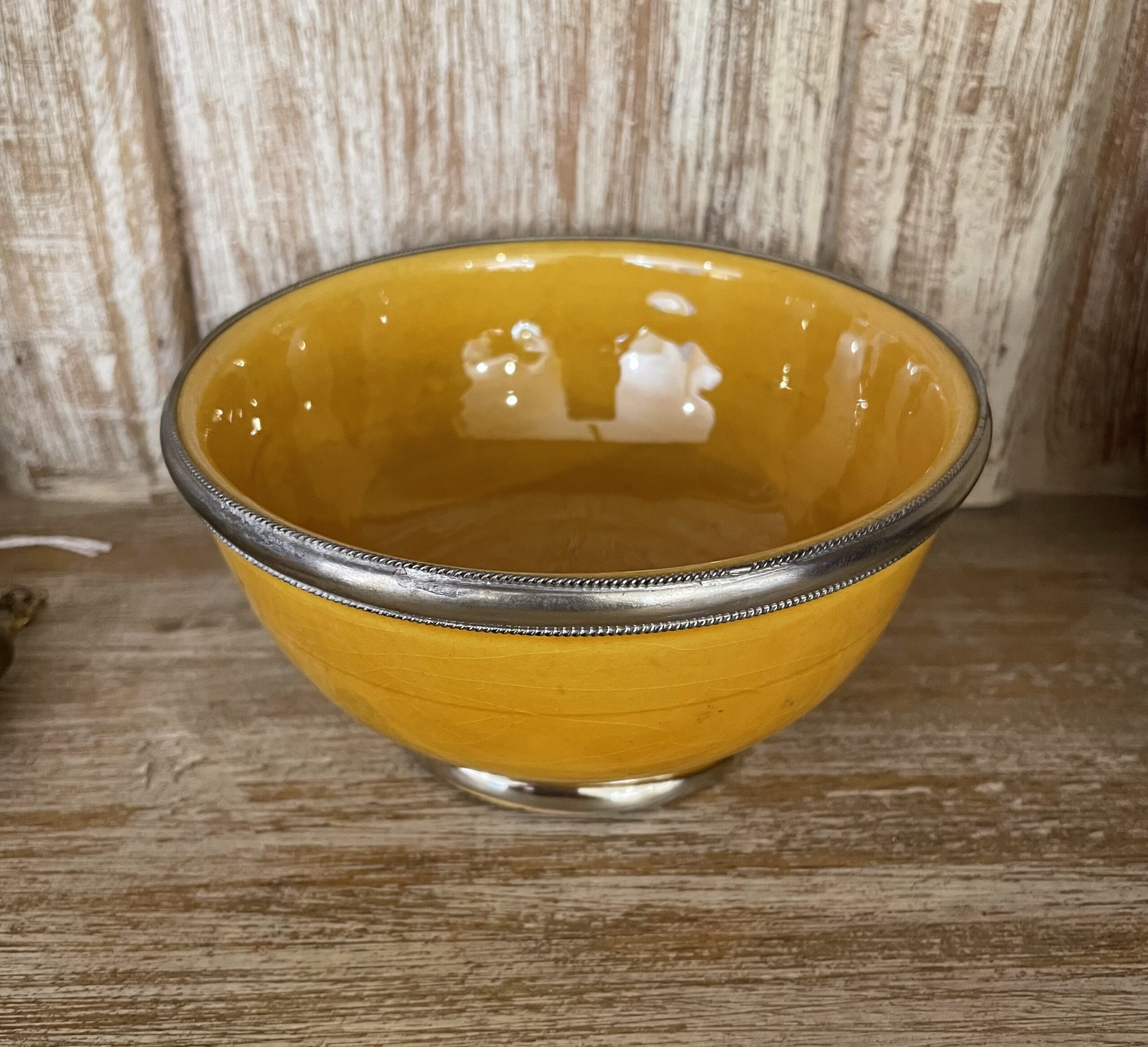 Il bordo e la base della ciotola sono rifiniti in argentone, un dettaglio che aggiunge un tocco di luminosità e contrasto al design complessivo. L’argento non solo impreziosisce la ciotola, ma crea anche un piacevole contrasto con l’ocra smaltato, mettendo in risalto la cura e l’attenzione ai dettagli, tipica dell’artigianato marocchino.