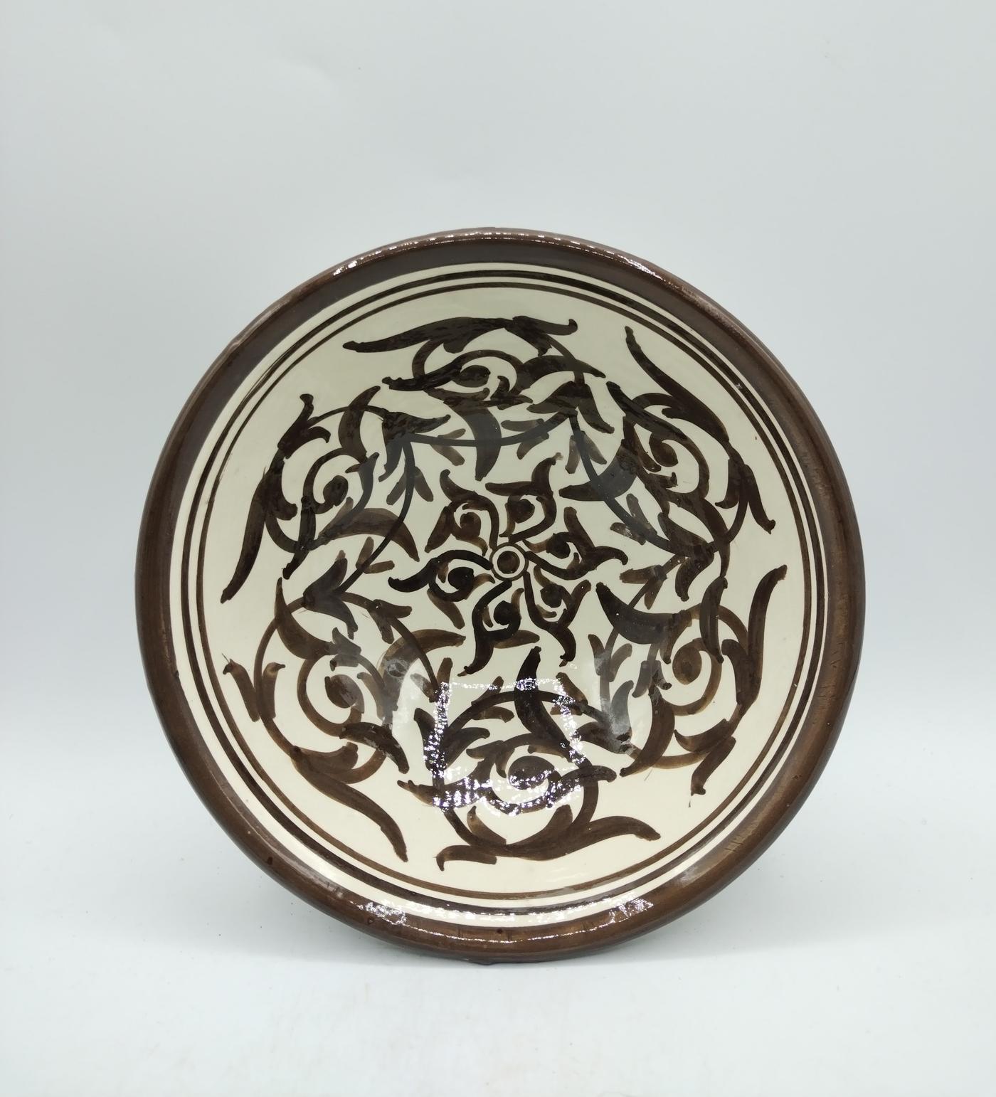 La superficie smaltata bianca nella parte interna ha decorazioni floreali tipiche marocchine sui toni del nero che si intrecciano armoniosamente, la parte esterna è decorata con delle linee nere che percorrono il bordo e la parte sottostante.
