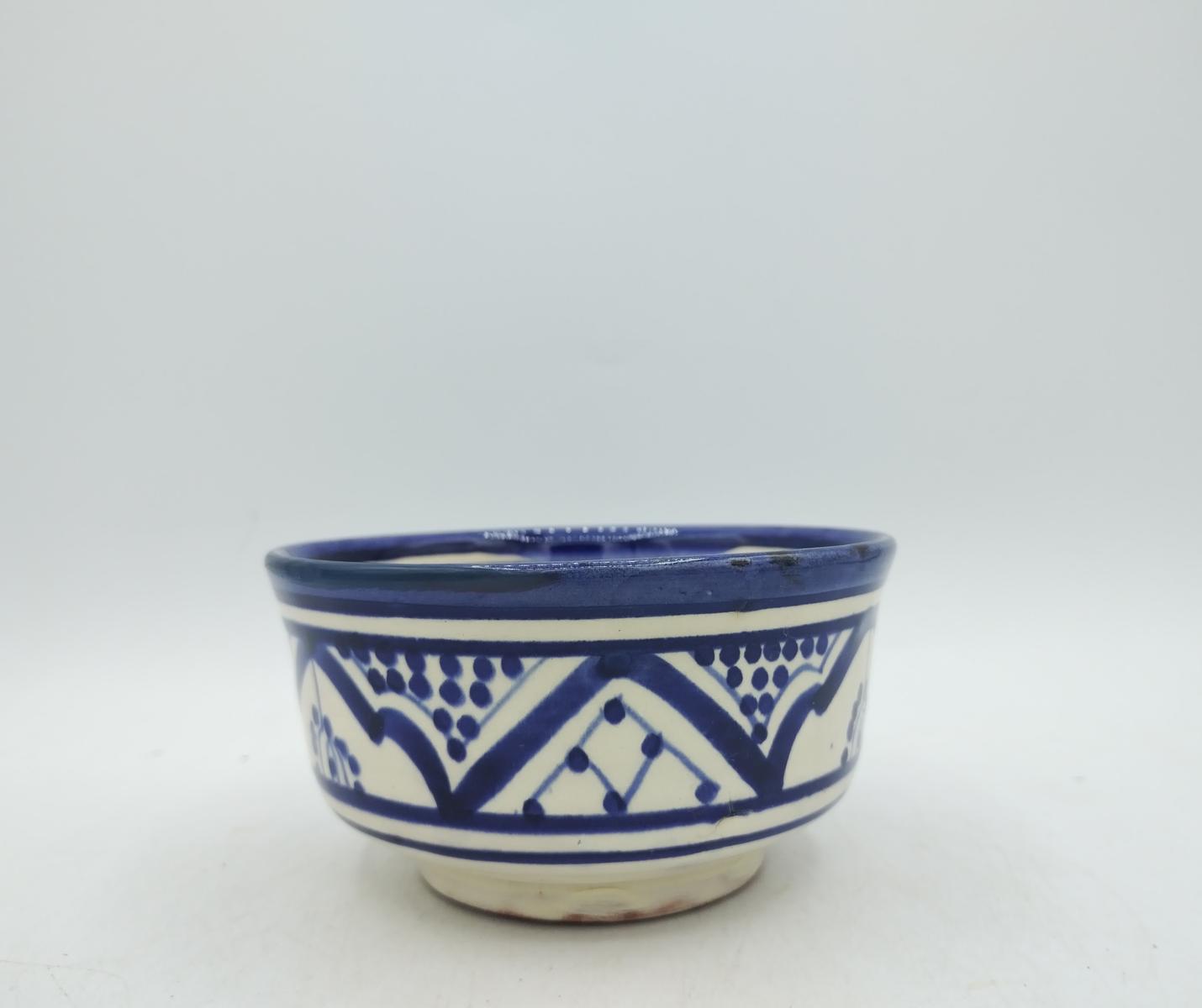 La superficie smaltata della ciotola ha decorazioni floreali e geometriche tipiche marocchine, che si intrecciano armoniosamente.