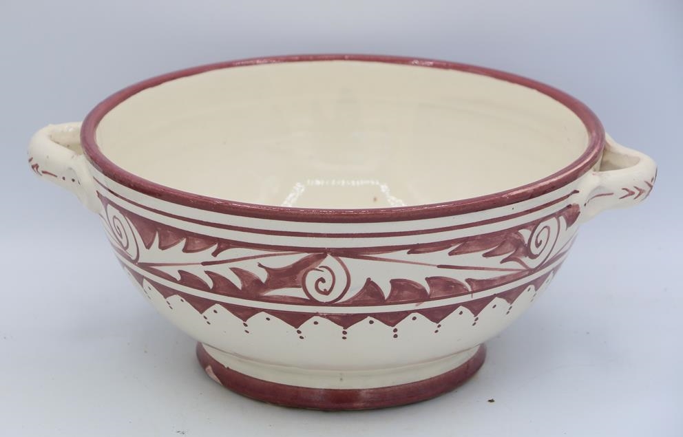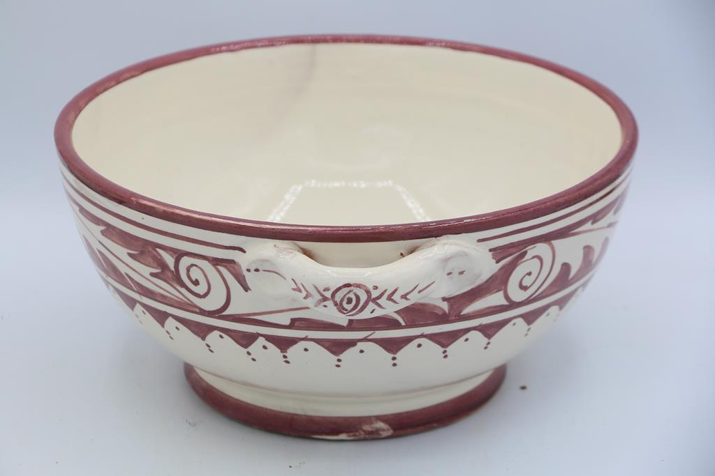 La superficie della ciotola è dipinta di un bianco puro e luminoso, che funge da tela per i raffinati disegni geometrici e floreali bordeaux. Ogni linea e figura è tracciata a mano con precisione e passione, creando un contrasto affascinante e armonioso tra il chiaro e lo scuro.