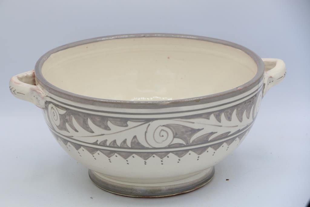 La superficie della ciotola è dipinta di un bianco puro e luminoso, che funge da tela per i raffinati disegni geometrici e floreali grigi. Ogni linea e figura è tracciata a mano con precisione e passione, creando un contrasto affascinante e armonioso tra il chiaro e lo scuro.
