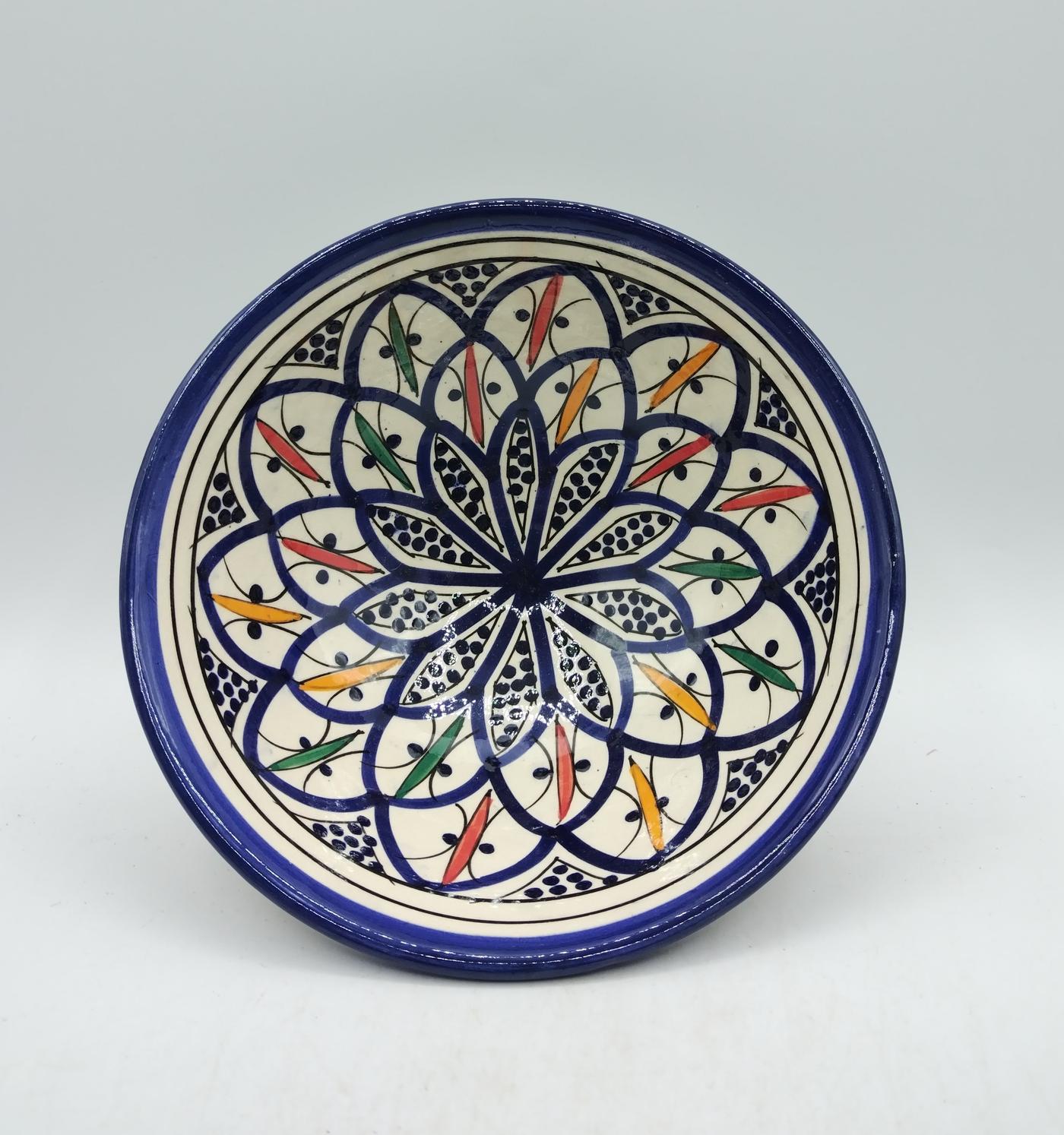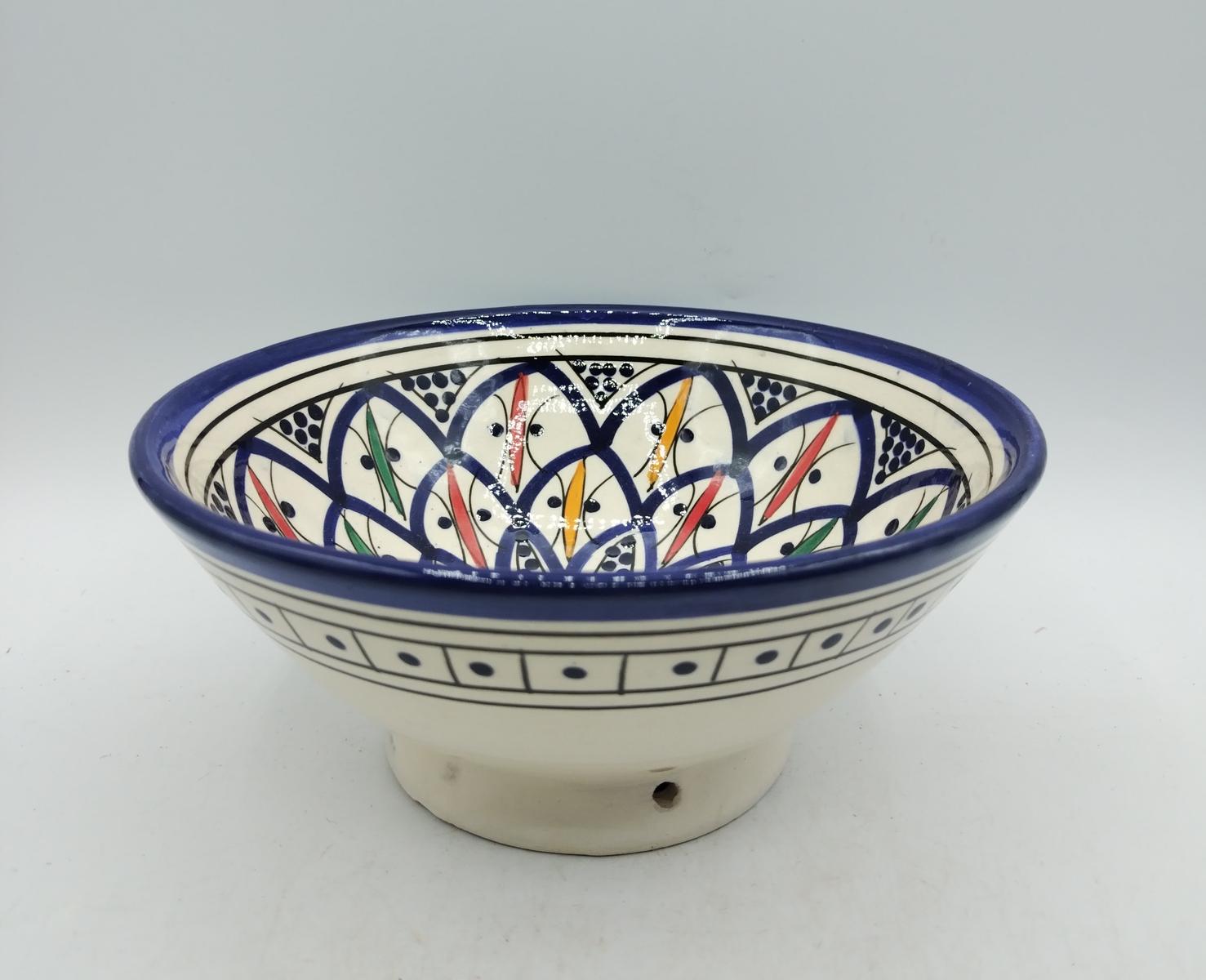 La superficie smaltata della ciotola ha decorazioni floreali e geometriche tipiche marocchine sui toni del bianco, blu, verde, rosso e giallo che si intrecciano armoniosamente.