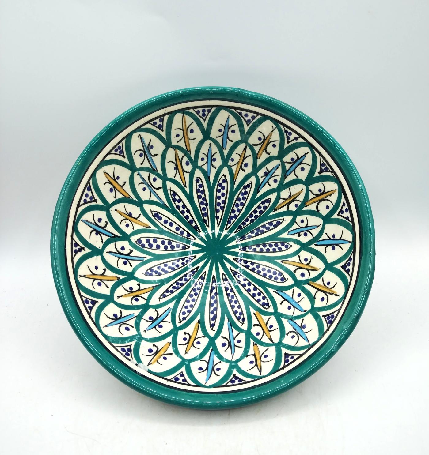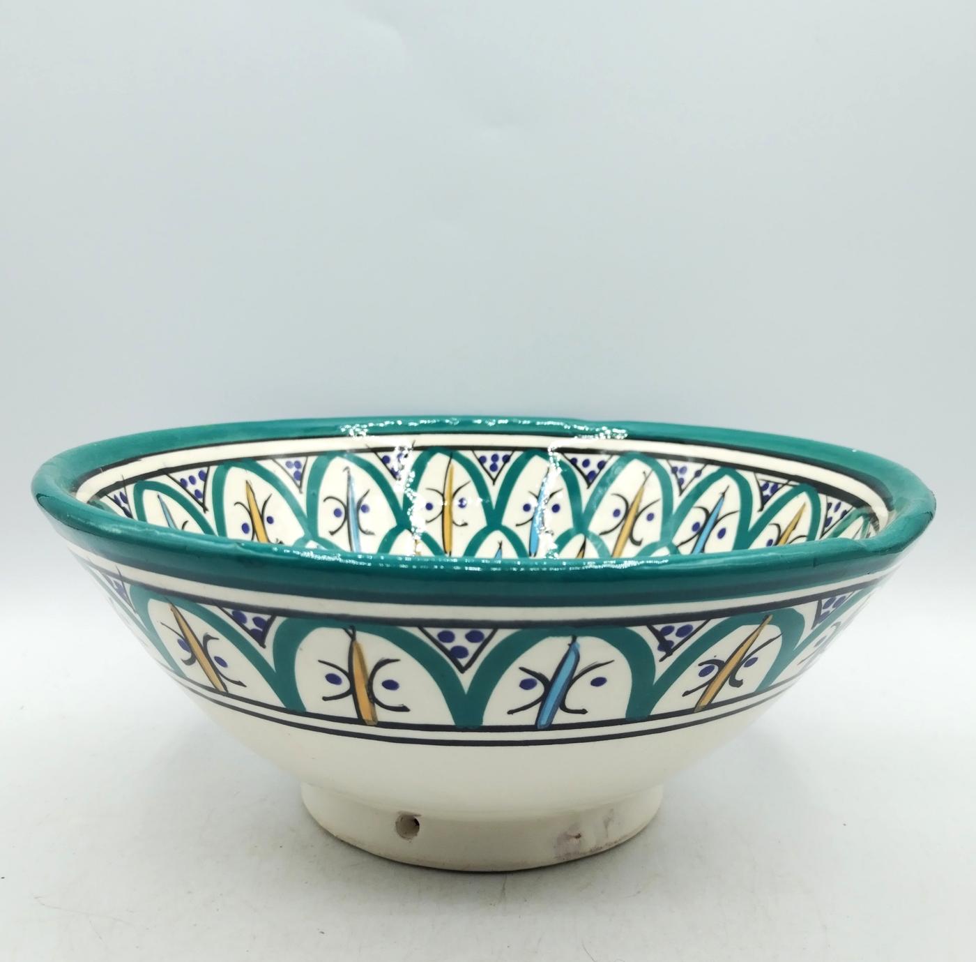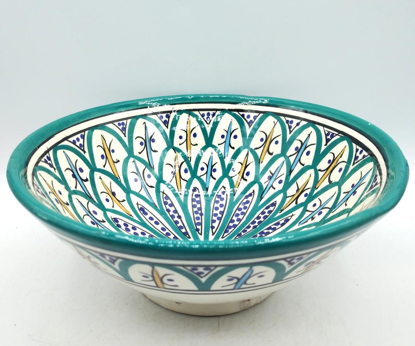 La superficie smaltata della ciotola ha decorazioni floreali e geometriche tipiche marocchine sui toni del bianco, turchese, azzurro, blu e giallo che si intrecciano armoniosamente.