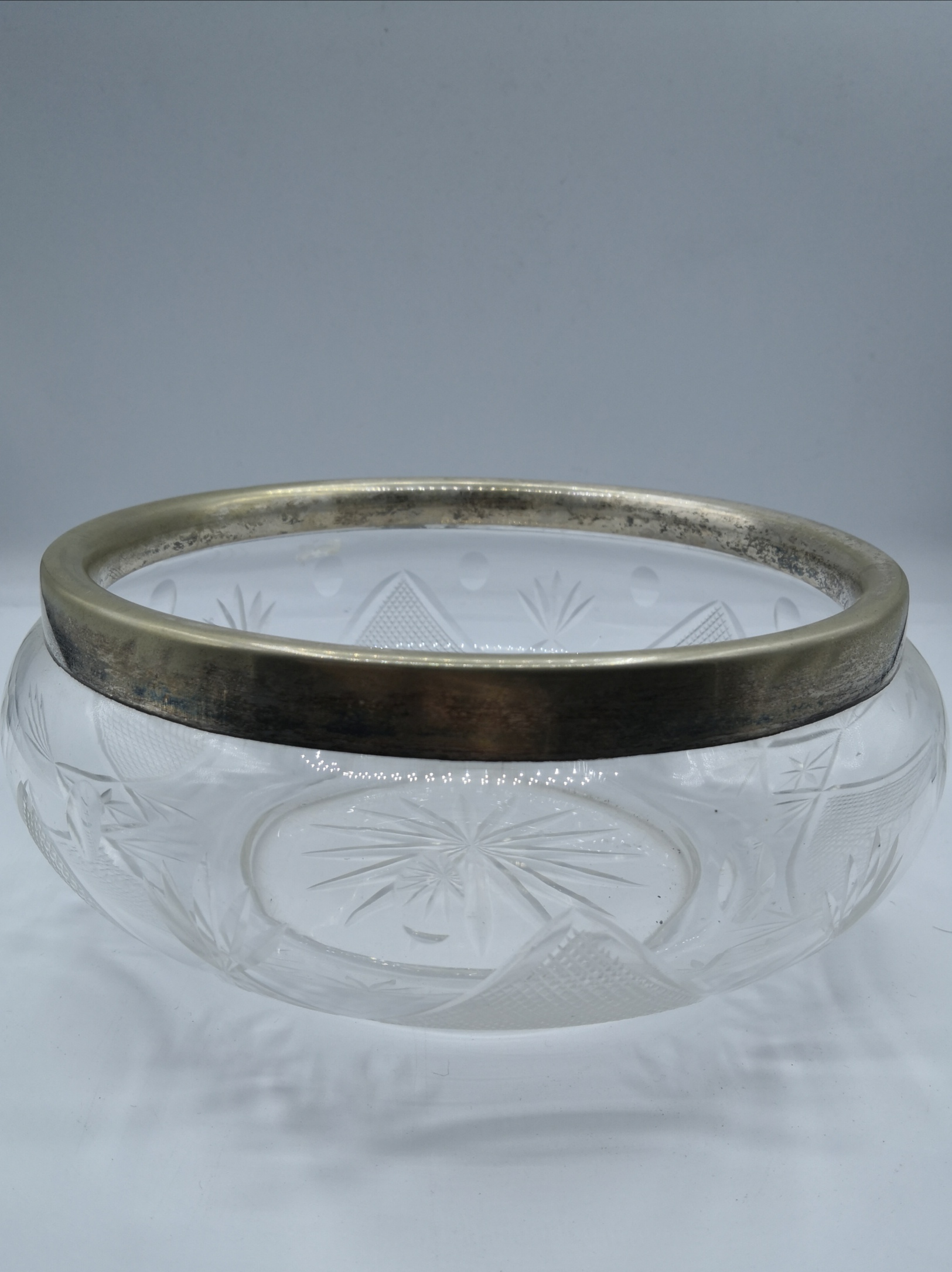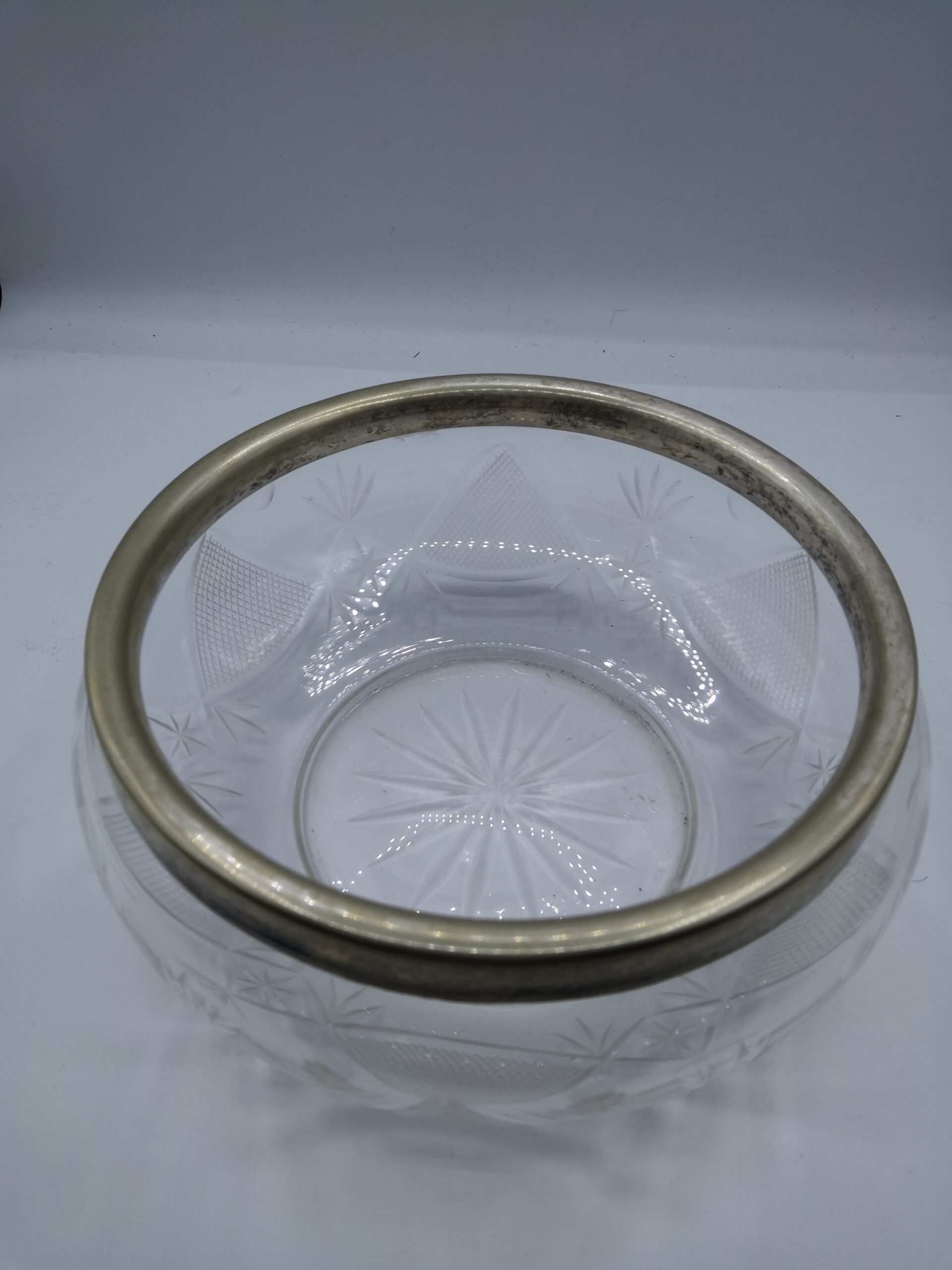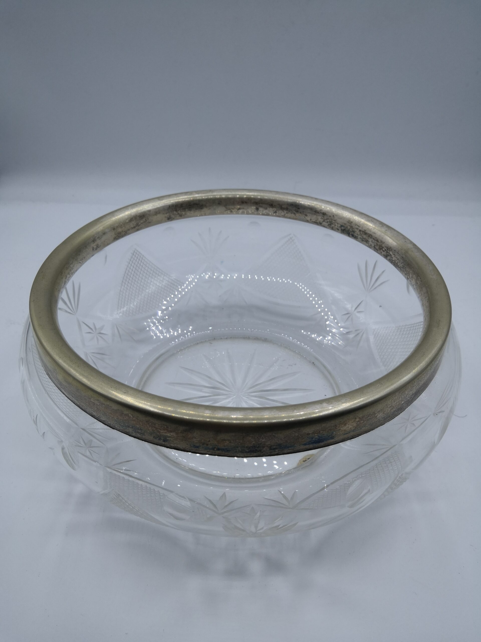 Ciotola in vetro incisa di epoca Vittoriana (fine 800) con bordo in sheffield.