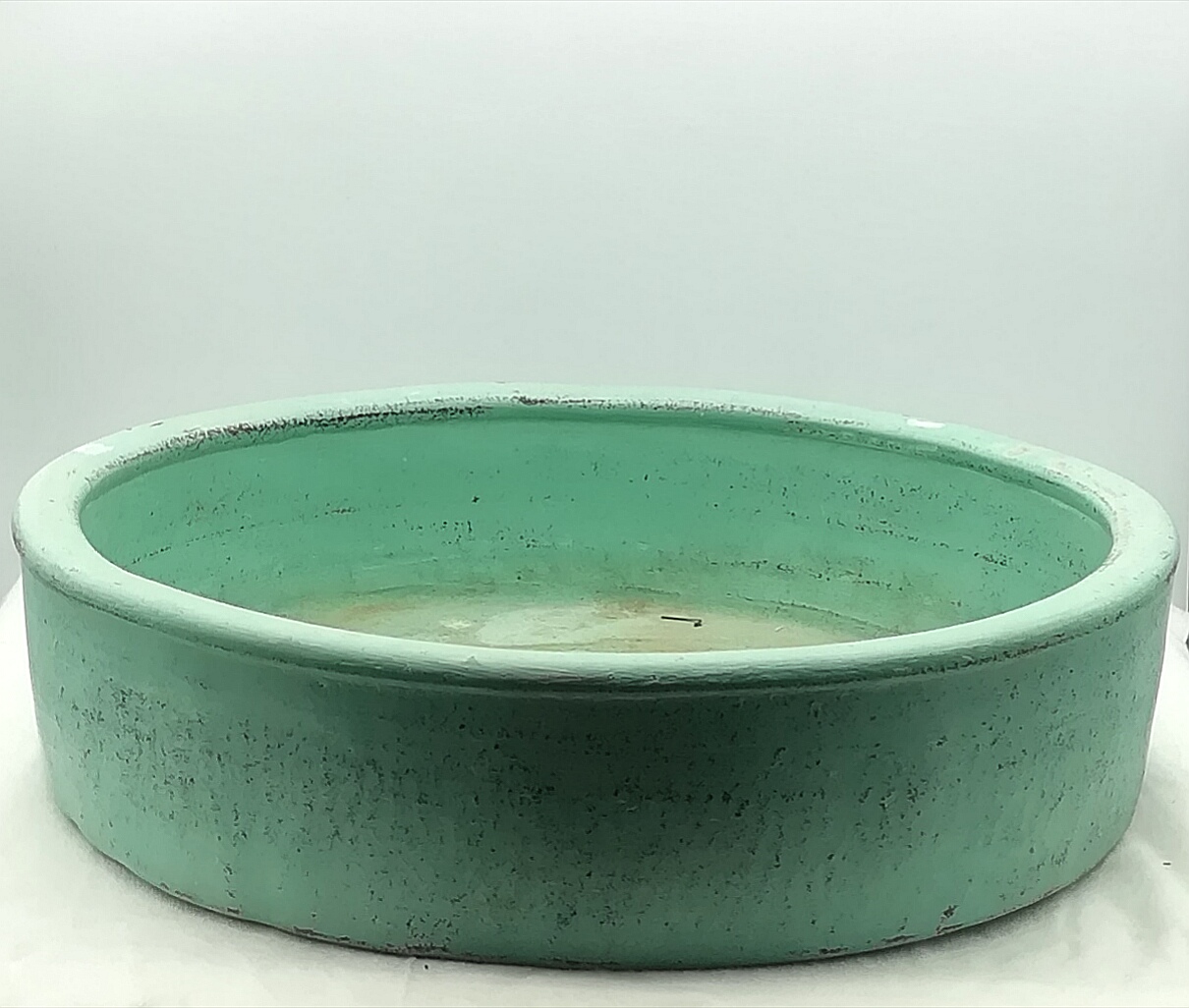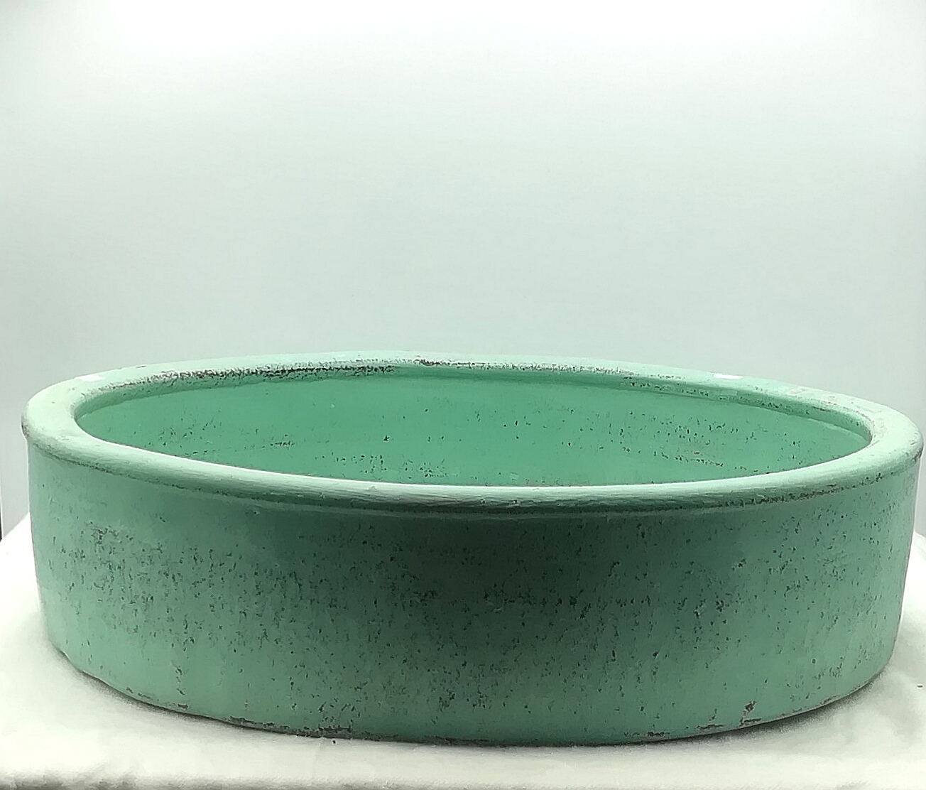 ciotola grande liscia bassa in terracotta decapata color verde acqua, realizzata artigianalmente in Indonesia