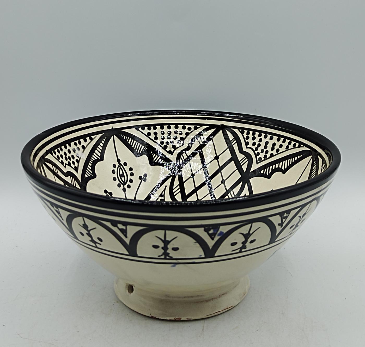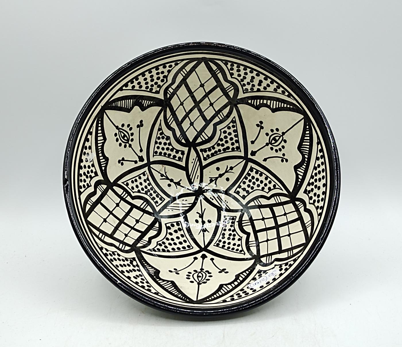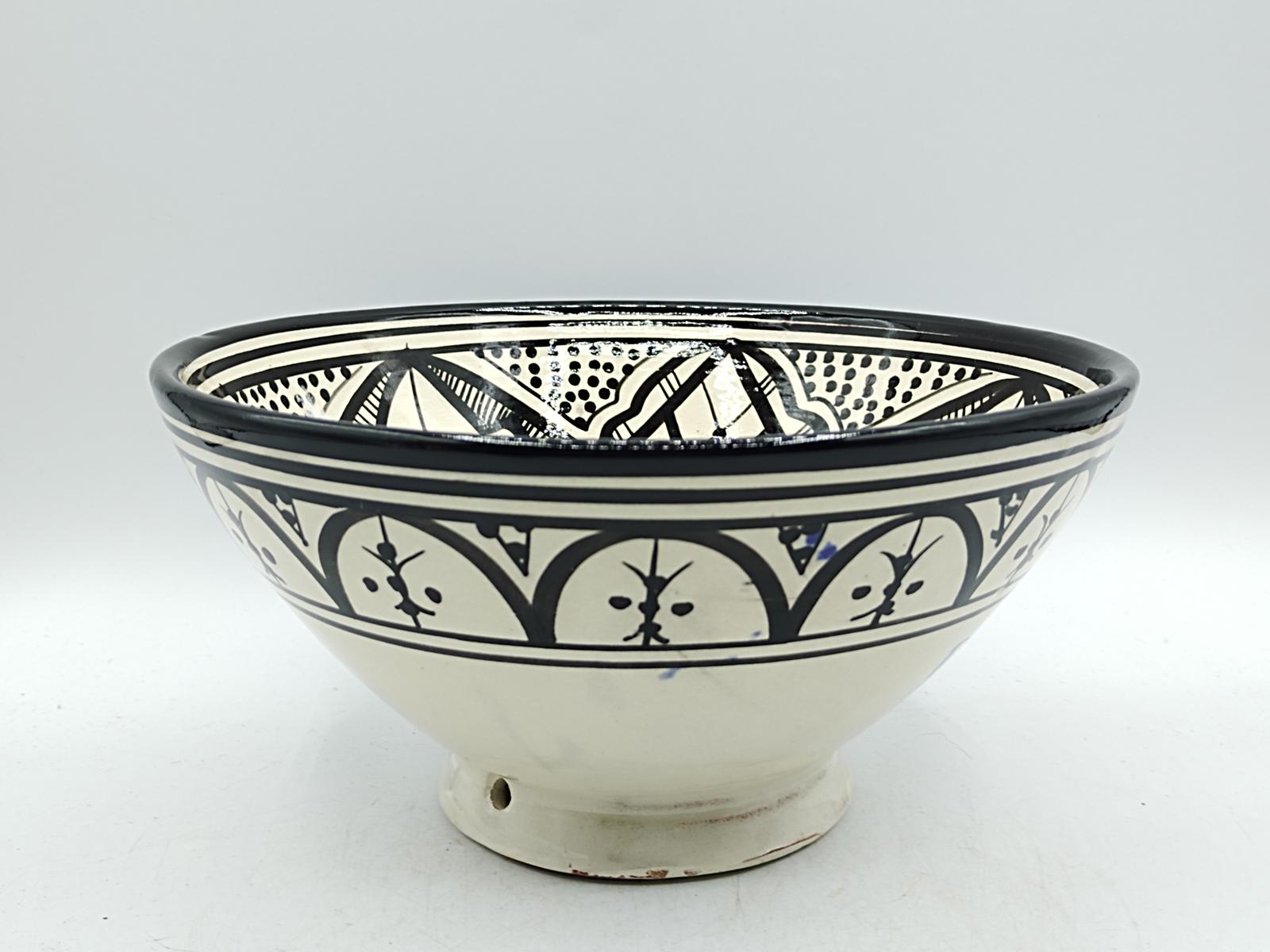 La superficie smaltata bianca nella parte interna ha decorazioni floreali e geometriche tipiche marocchine sui toni del nero che si intrecciano armoniosamente, la parte esterna è decorata con delle linee e delle decorazioni geometriche nere che percorrono il bordo e la parte sottostante.