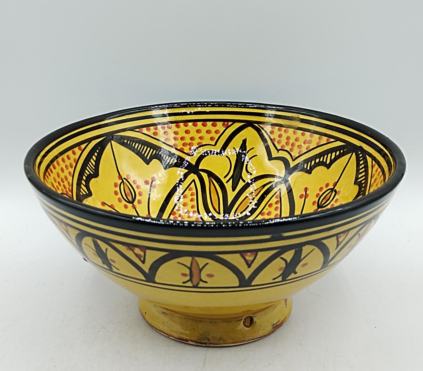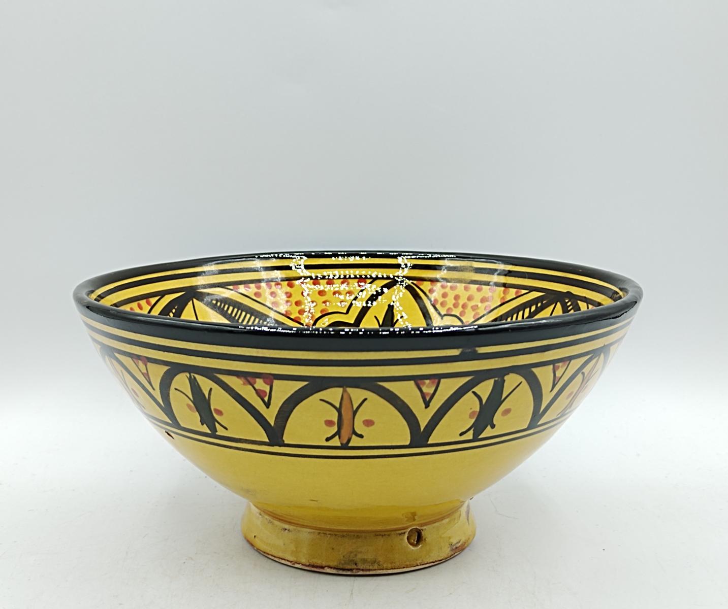 La superficie smaltata ocra nella parte interna ha decorazioni floreali e geometriche tipiche marocchine sui toni del nero e rosso che si intrecciano armoniosamente, la parte esterna è decorata con delle linee e delle decorazioni geometriche nere, verdi e rosse che percorrono il bordo e la parte sottostante.