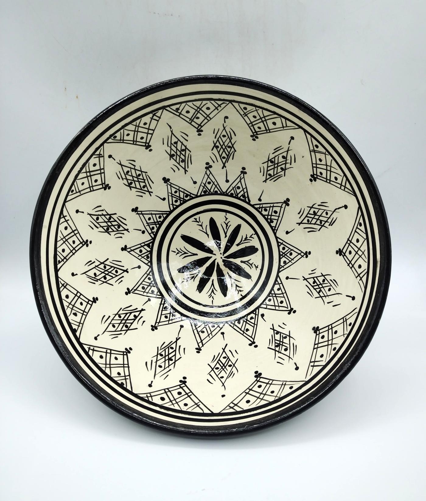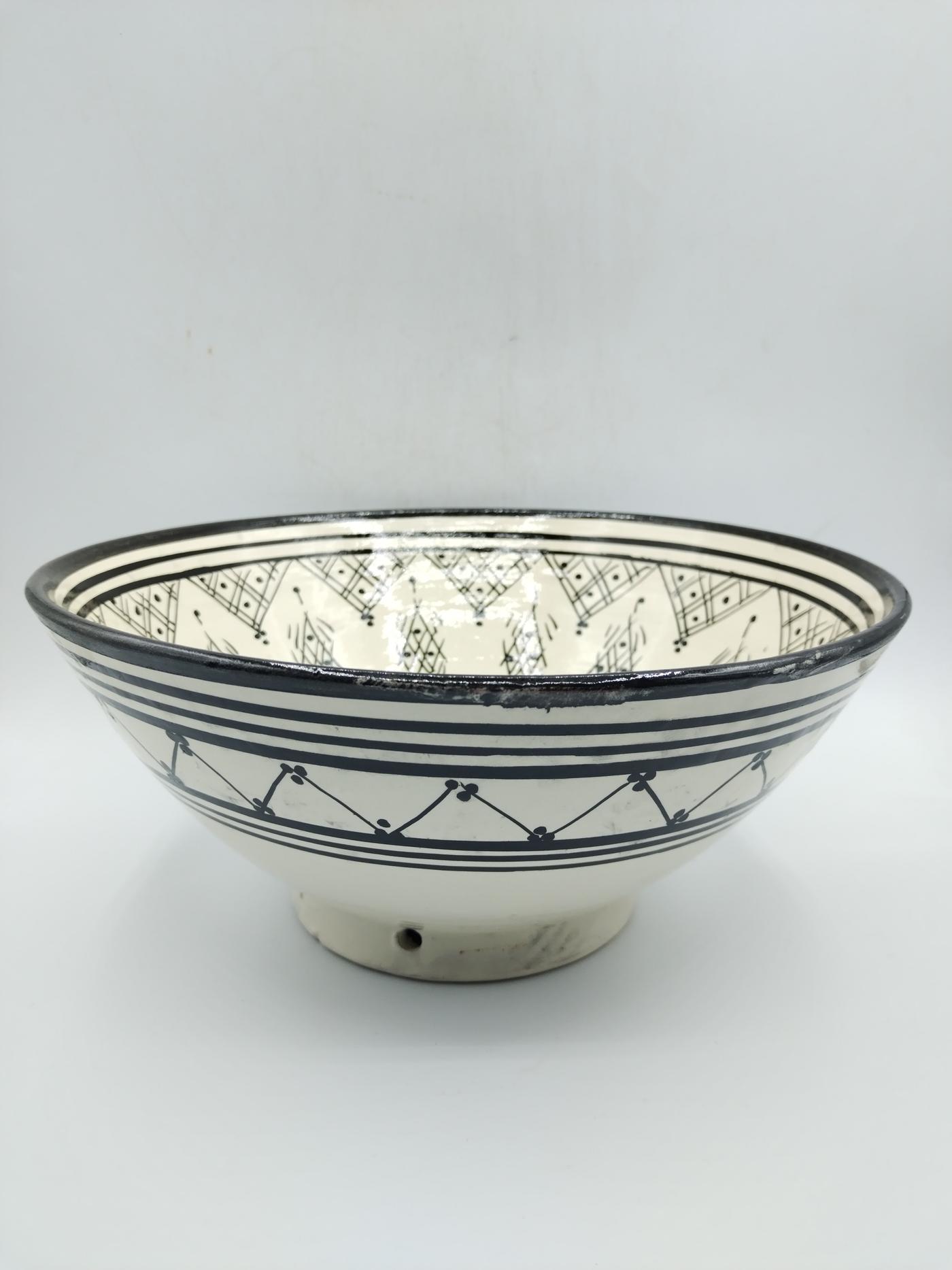 Ciotola realizzata artigianalmente in Marocco, dipinta a mano, in terracotta smaltata bianca, decorata con decori floreali e geometrici neri