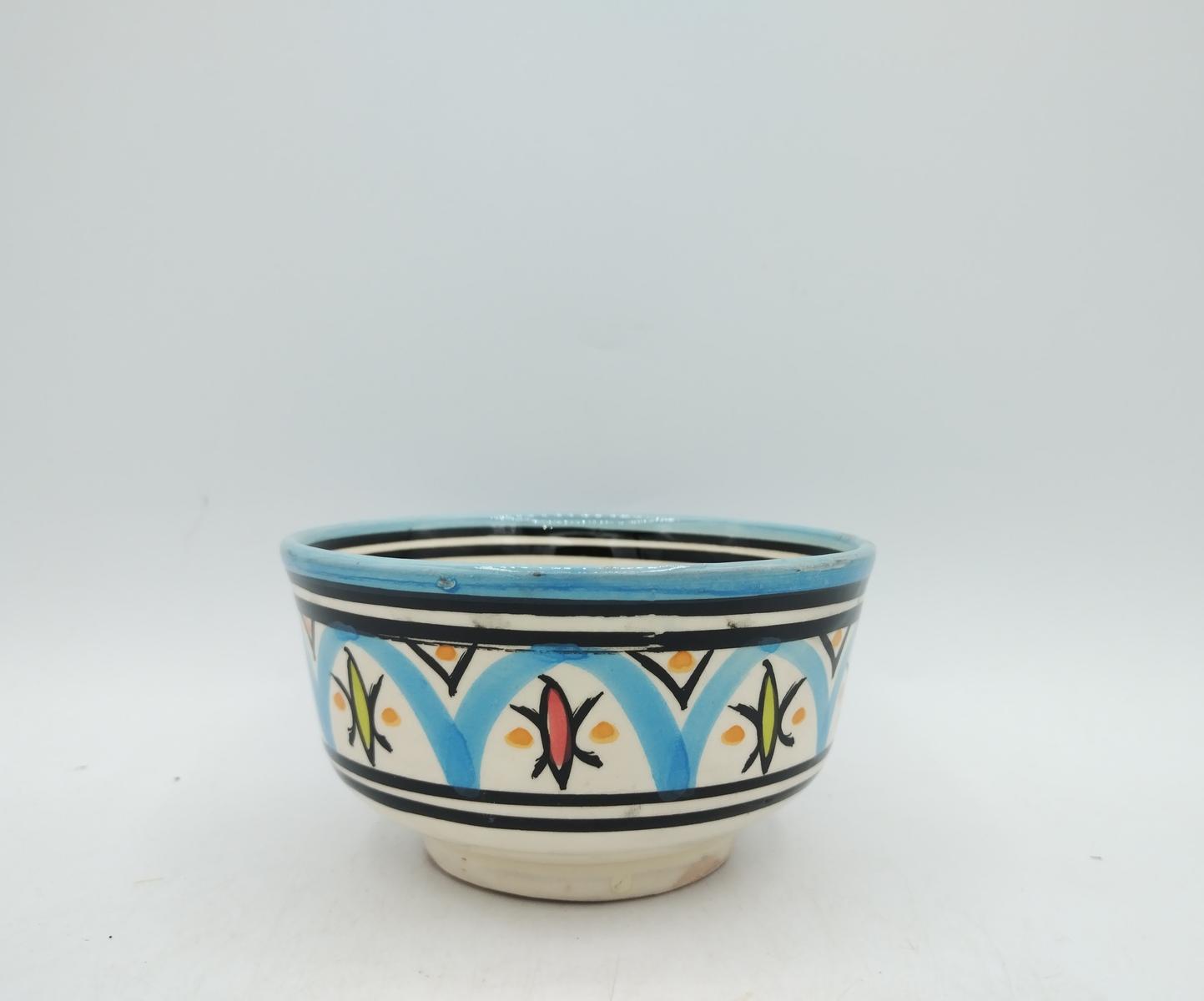 La superficie smaltata della ciotola ha decorazioni floreali e geometriche tipiche marocchine sui toni del bianco, azzurro e giallo, che si intrecciano armoniosamente.