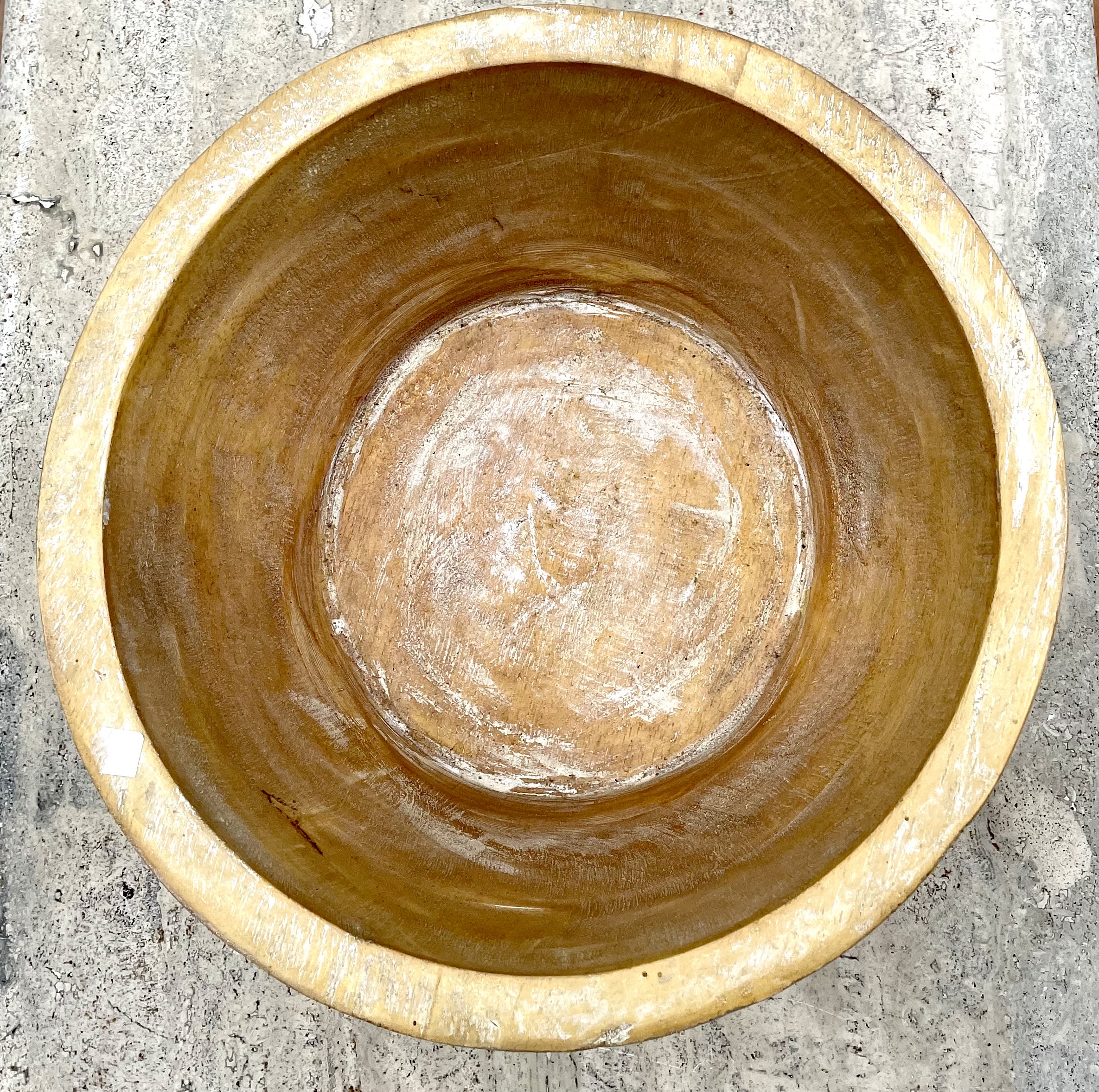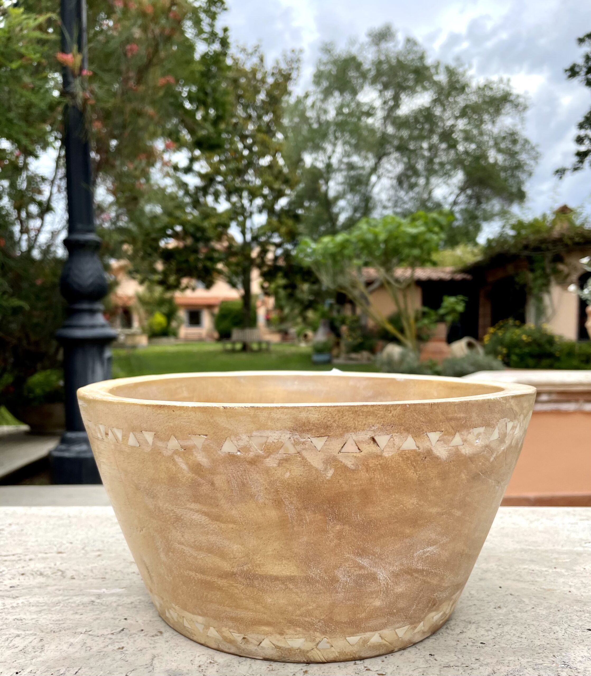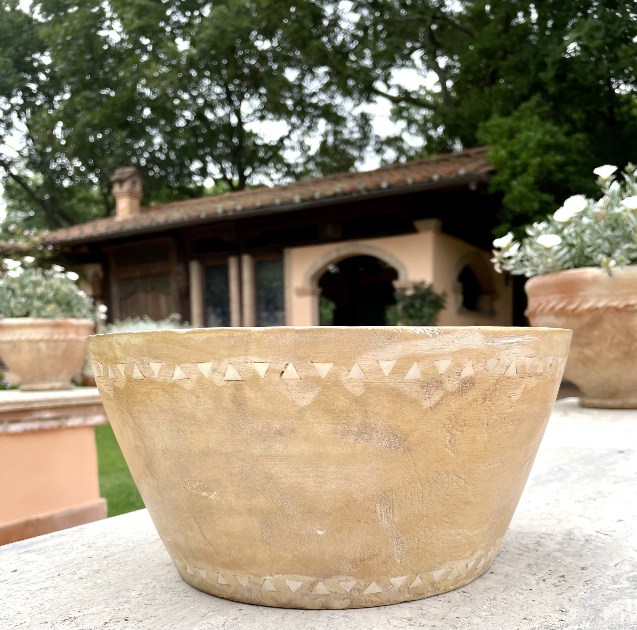 Il legno chiaro utilizzato per la ciotola ha una finitura liscia e naturale che mette in risalto le venature delicate e la bellezza intrinseca del materiale. La parte superiore della ciotola è decorata con inserti a motivo geometrico di madreperla, che formano una fascia continua che gira tutto intorno al bordo.