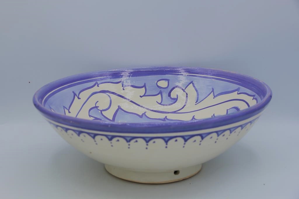Ciotola realizzata artigianalmente in Marocco, dipinta a mano, decorata con decori floreali e geometrici bianchi e blu violetto.