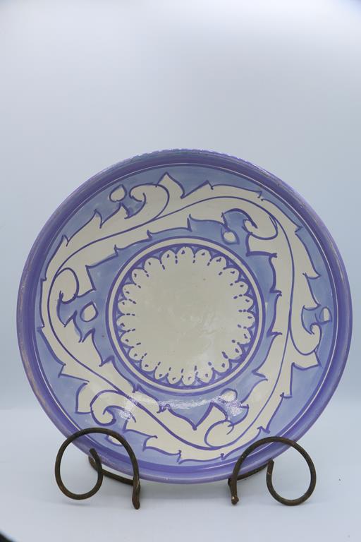 La superficie della ciotola è dipinta di un bianco puro e luminoso, che funge da tela per i raffinati disegni geometrici e floreali sui toni del blu viola. Ogni linea e figura è tracciata a mano con precisione e passione, creando un contrasto affascinante e armonioso tra il chiaro e lo scuro.
