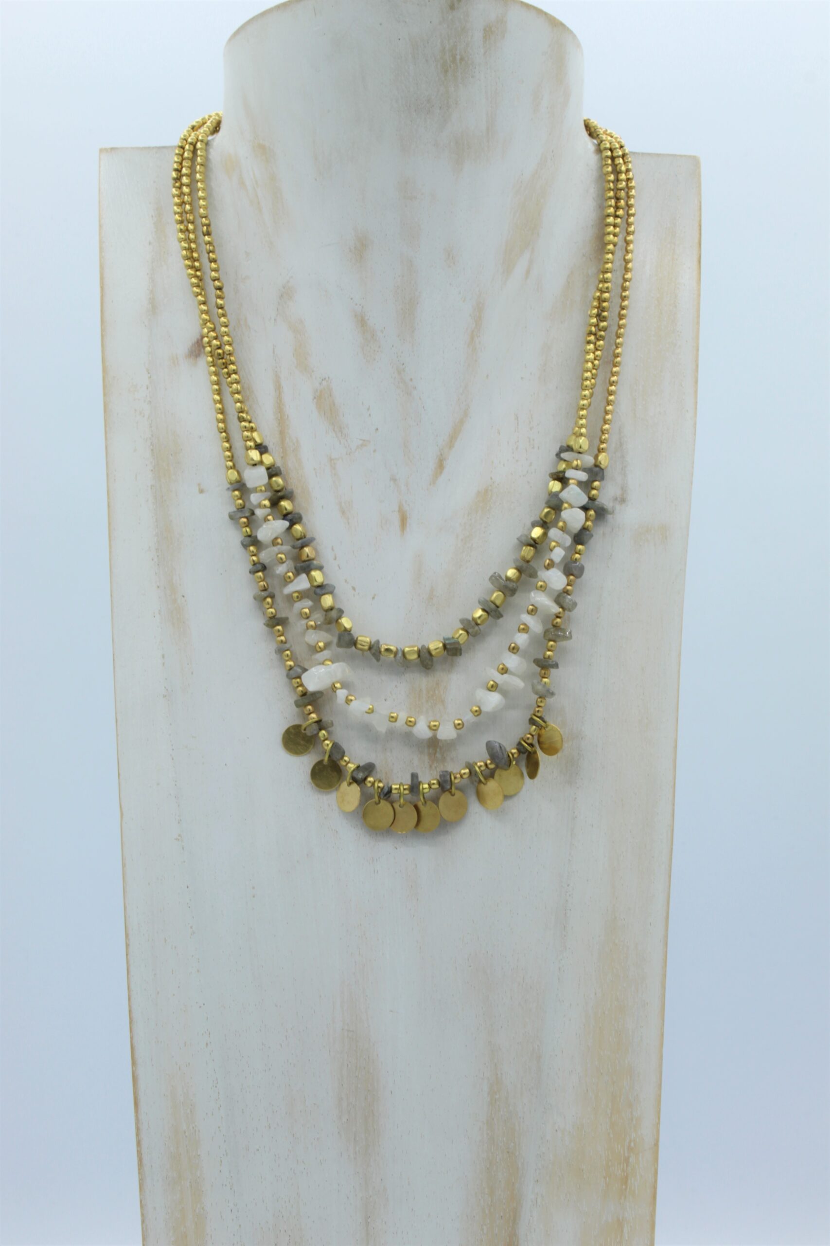 Collana prodotta artigianalmente in India realizzata con più fili oro di diversa lunghezza con piccole pietre bianche e grigie alternate a perline dorate, pendenti circolari oro