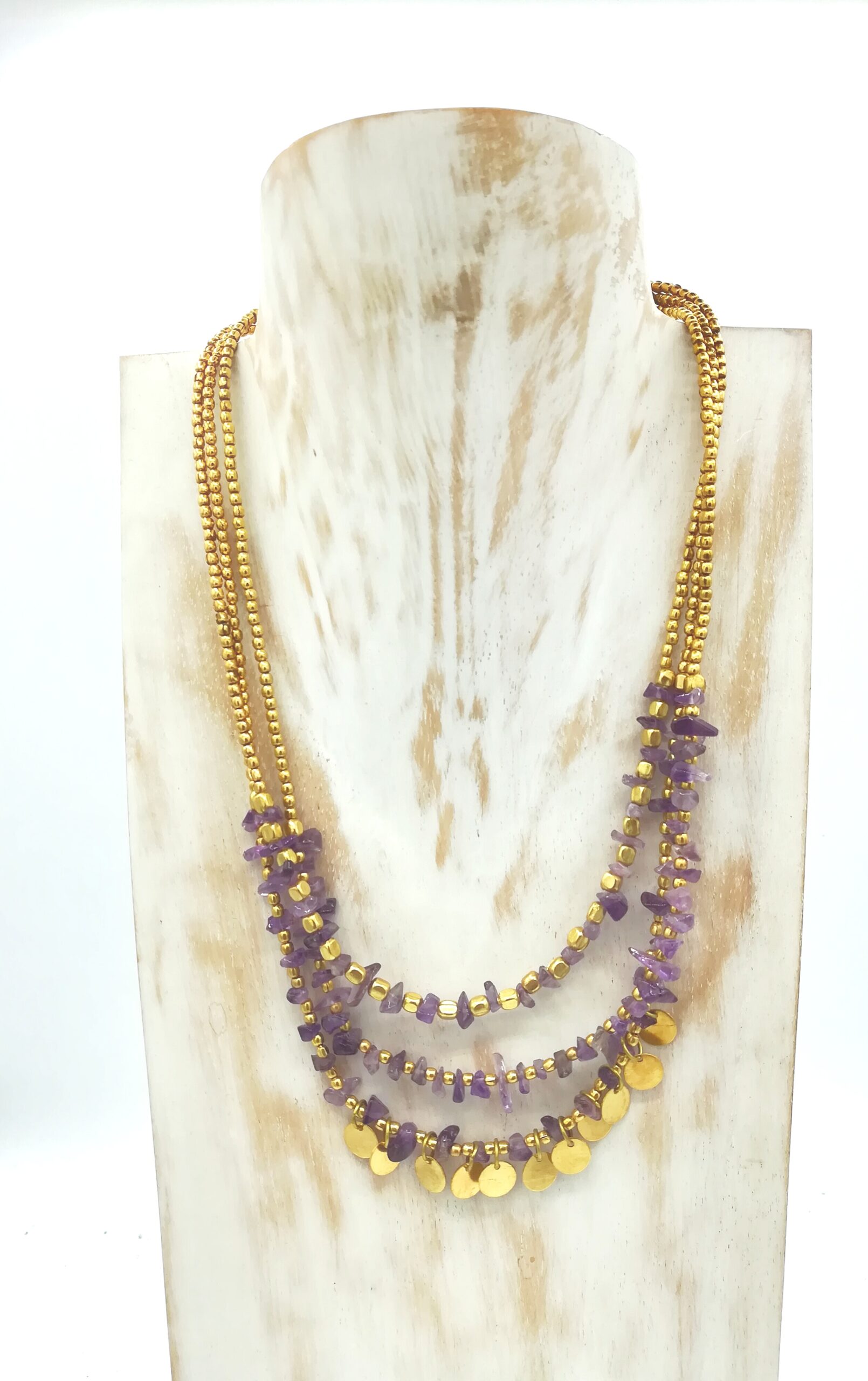 Collana prodotta artigianalmente in India realizzata con più fili oro di diversa lunghezza con piccole sui toni del viola alternate a perline dorate, pendenti circolari oro