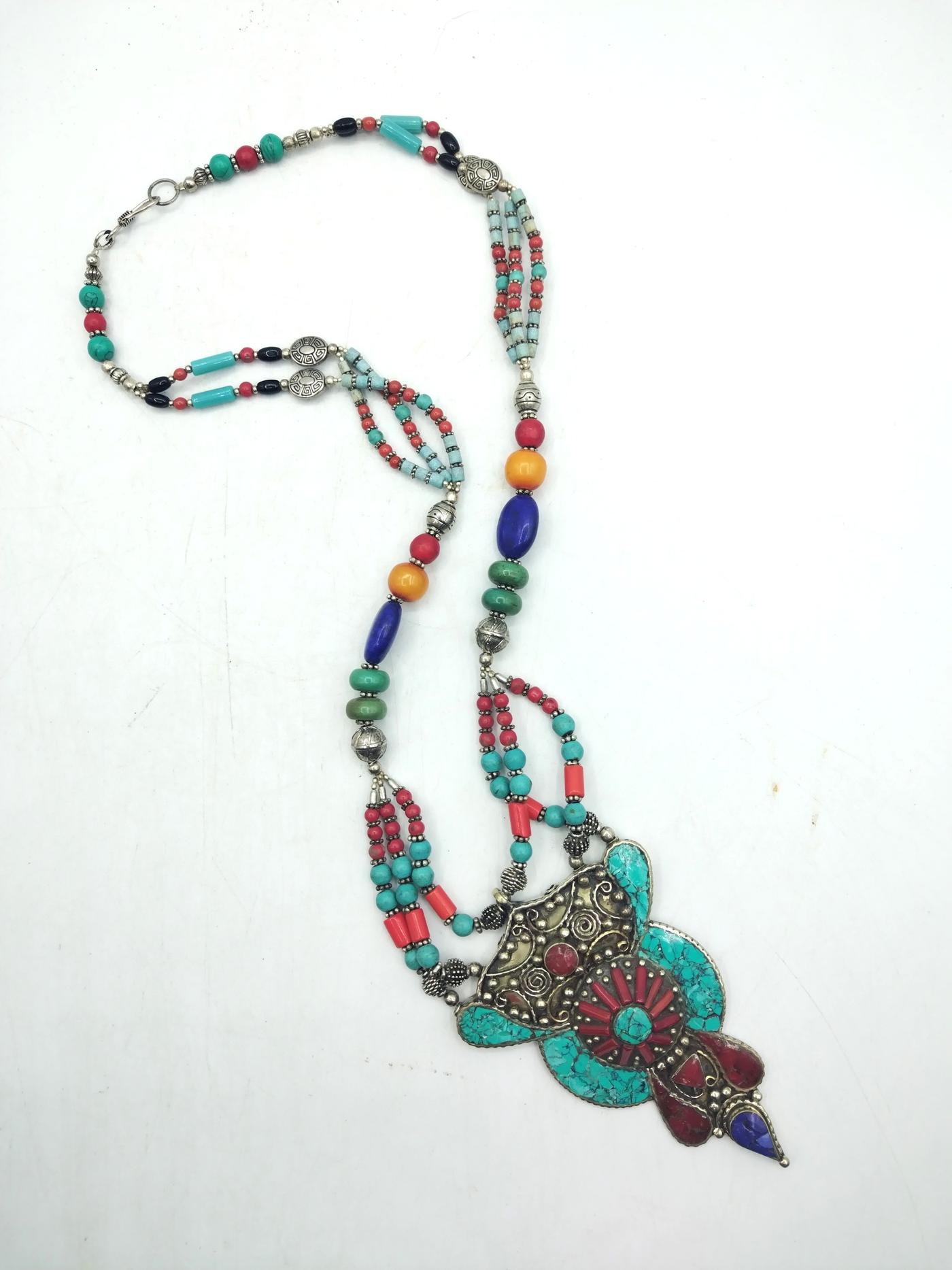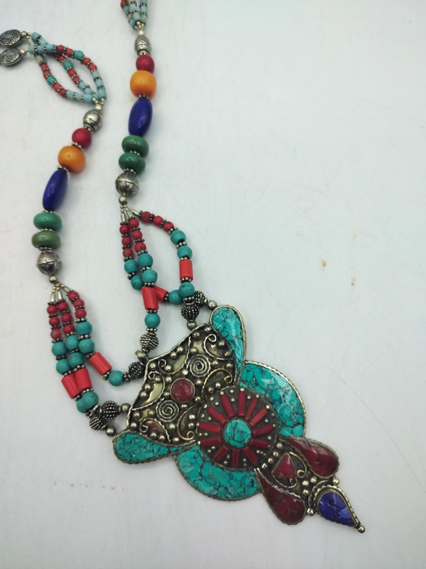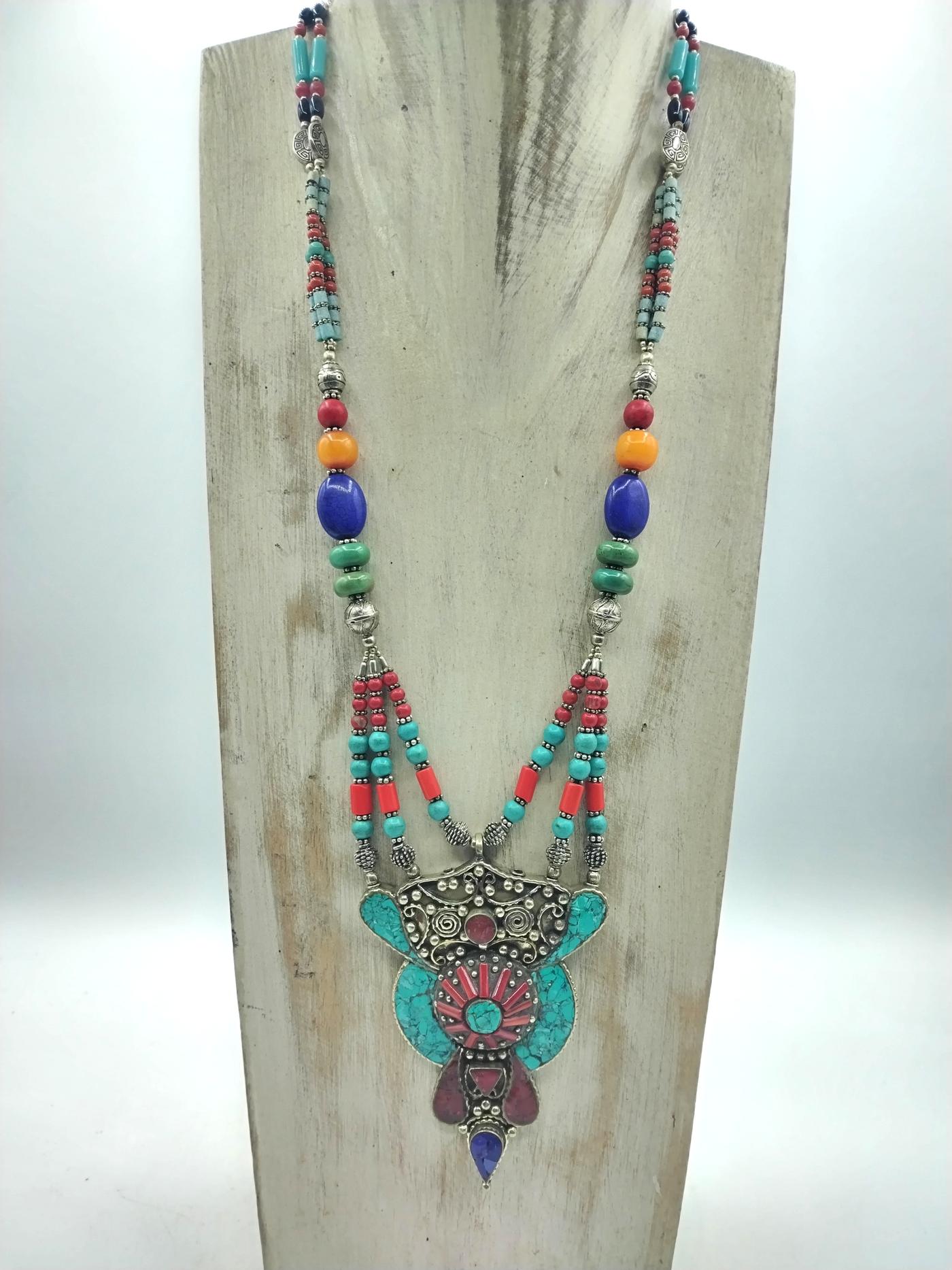 Turchesi, coralli e pietre sui toni dell’arancio, del blu e del verde ornano questa scenica collana donandole un carattere unico.