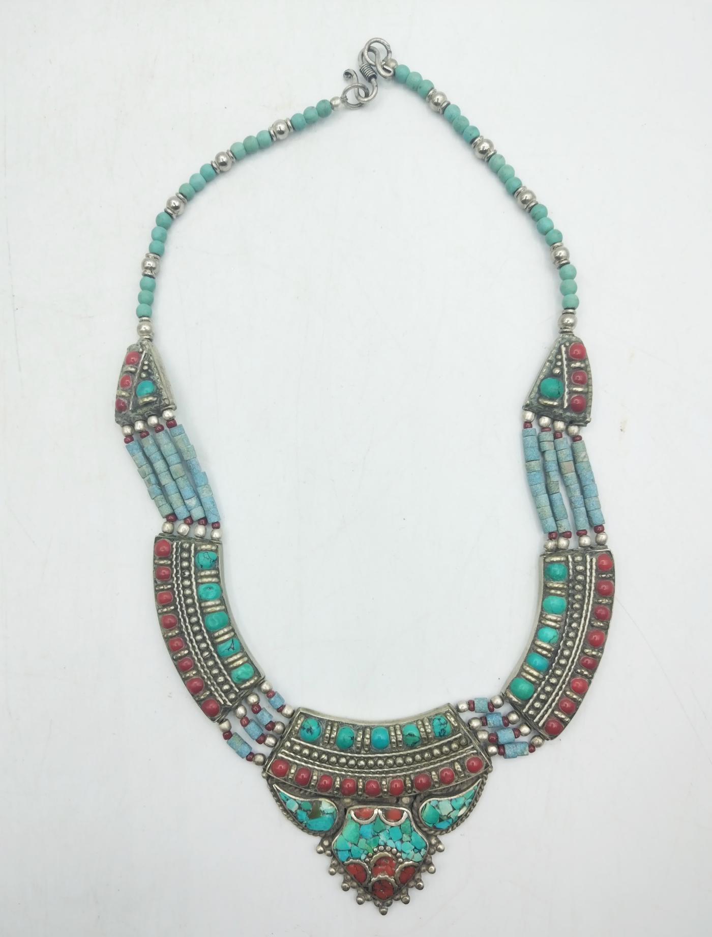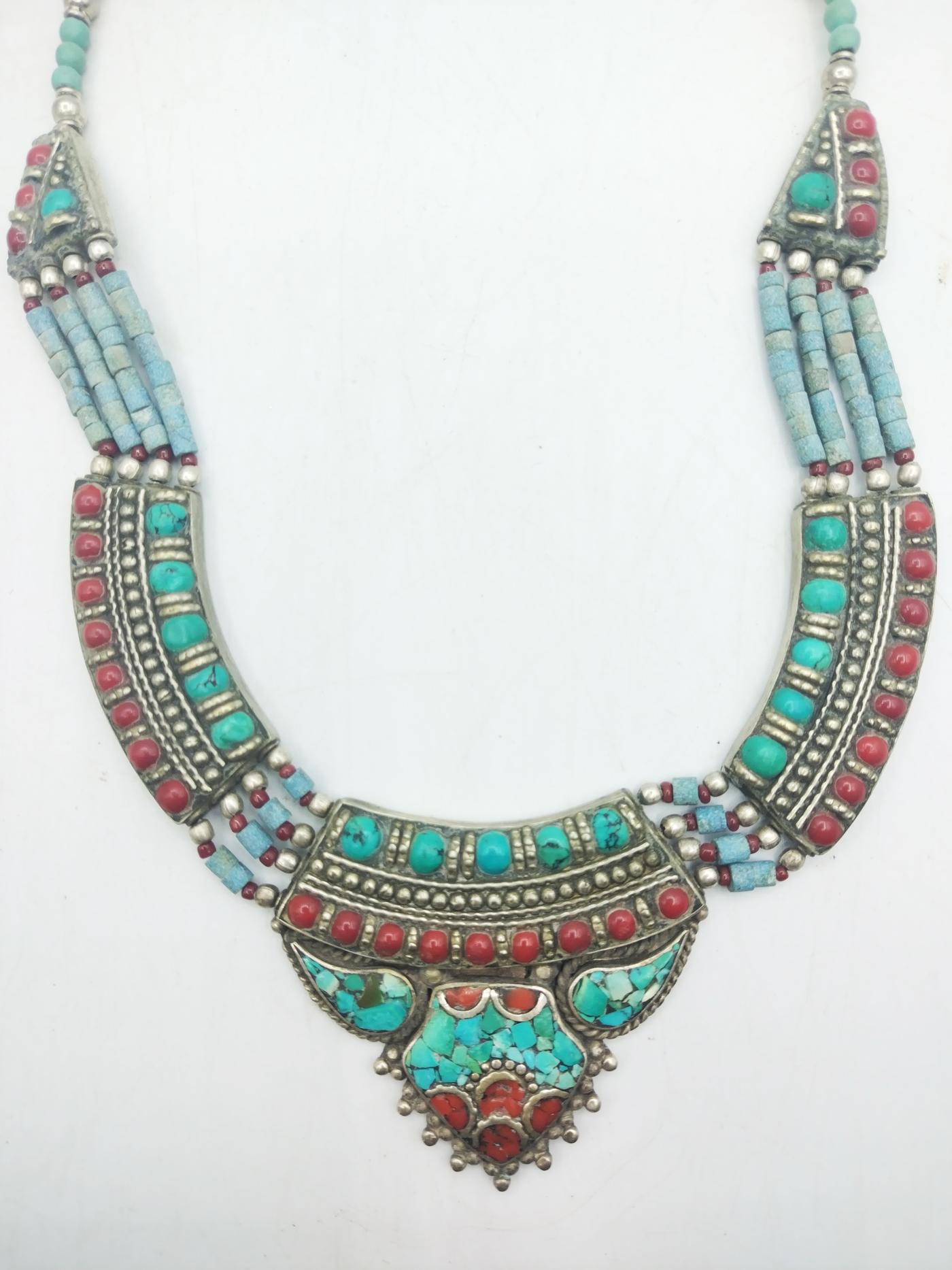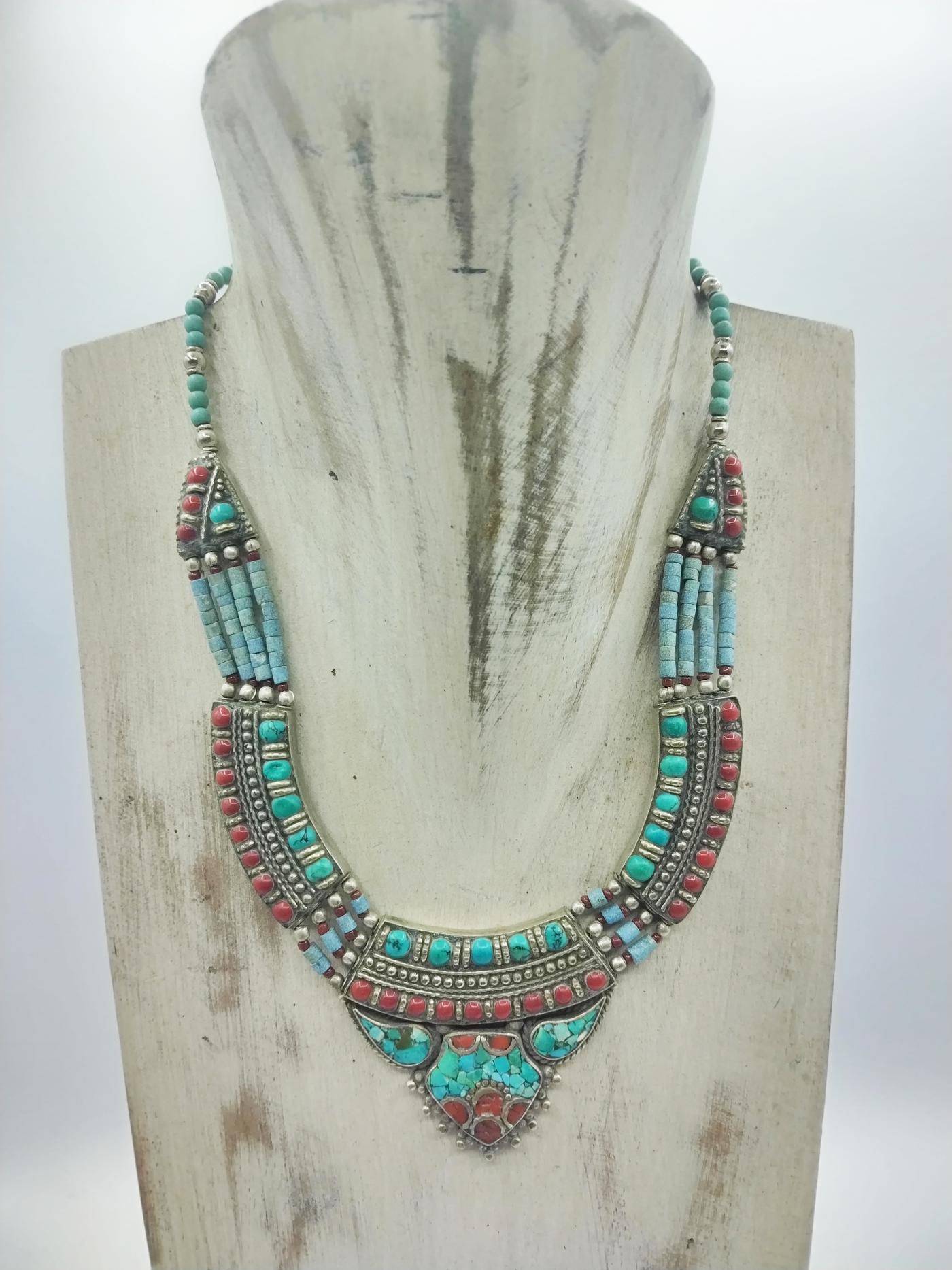 Al centro risalta un pendente di grande impatto visivo, in cui pietre dure di diverse dimensioni e colori (turchesi, coralli) si combinano in eleganti motivi geometrici tipici dello stile berbero.