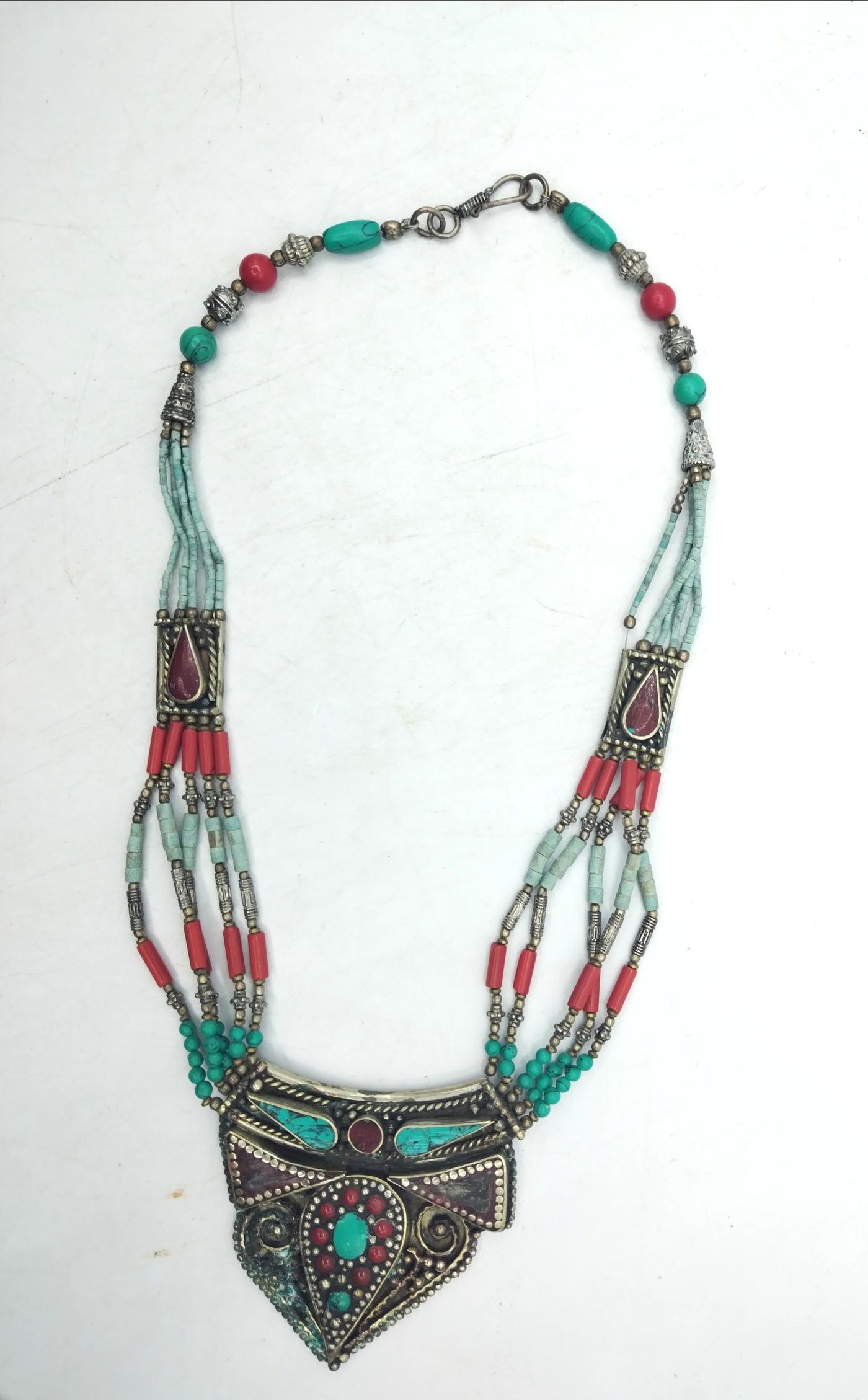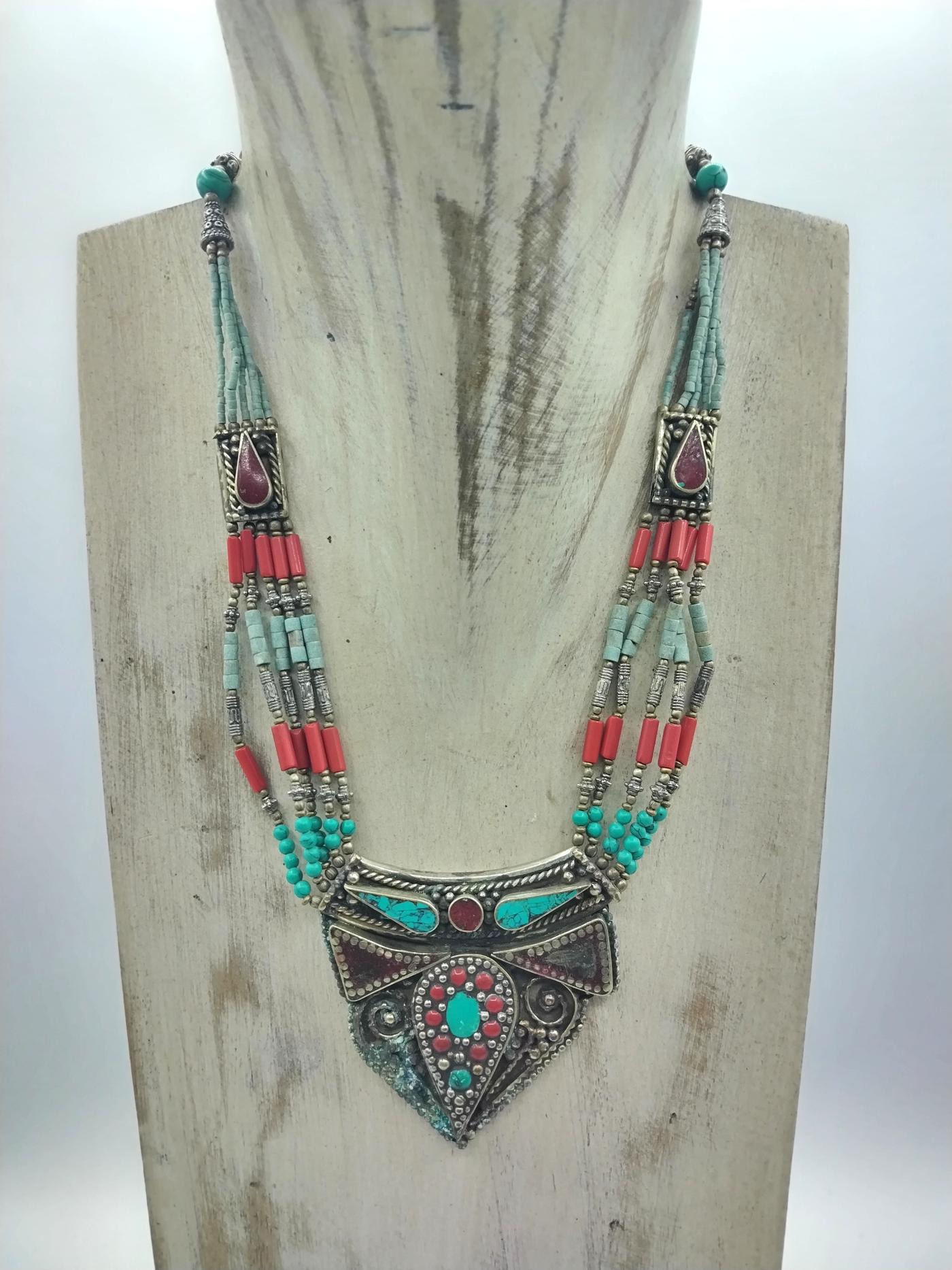 Morbidi fili di piccole perline turchesi e rosso corallo si alternano fino ad arrivare al pendaglio centrale , aggiungendo un tocco di leggerezza e movimento alla composizione.