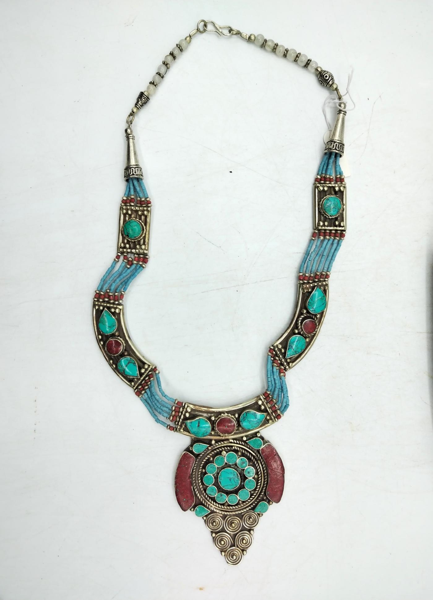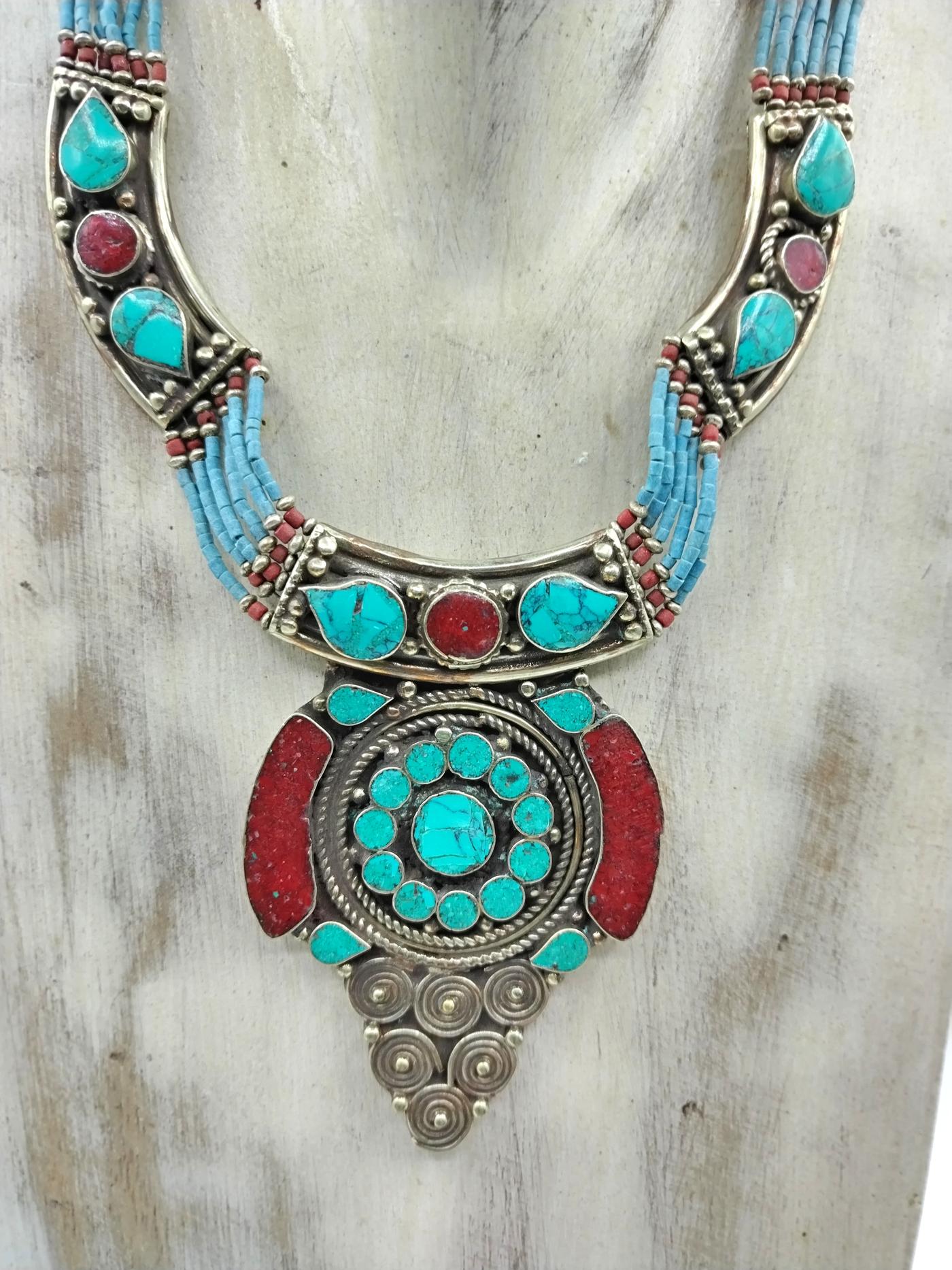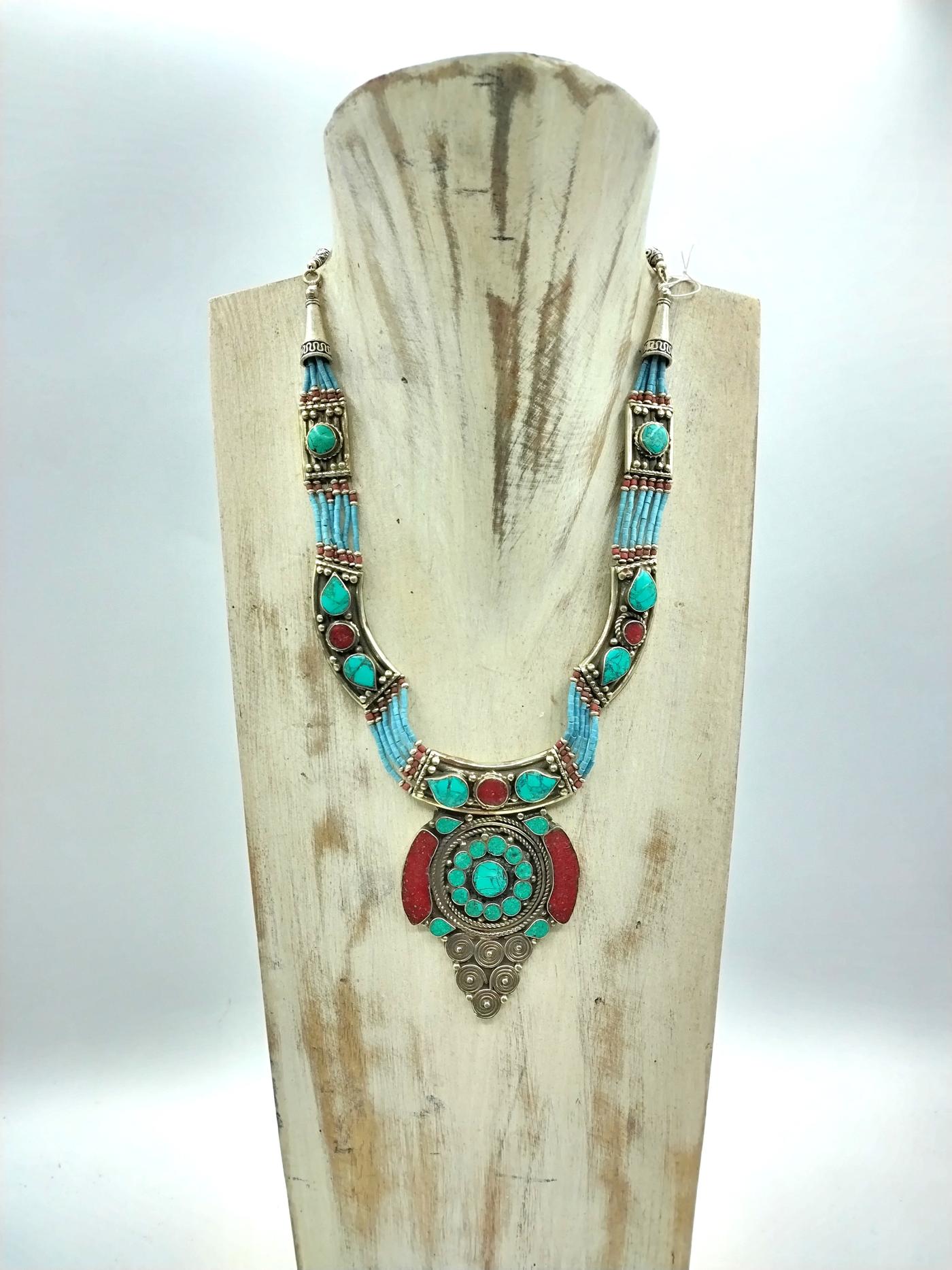 Fili di piccole perline azzurre si alternano alle parti rigide della collana, in cui troviamo pietre turchesi e rosse di grandi dimensioni, aggiungendo un tocco di leggerezza e movimento alla composizione.
