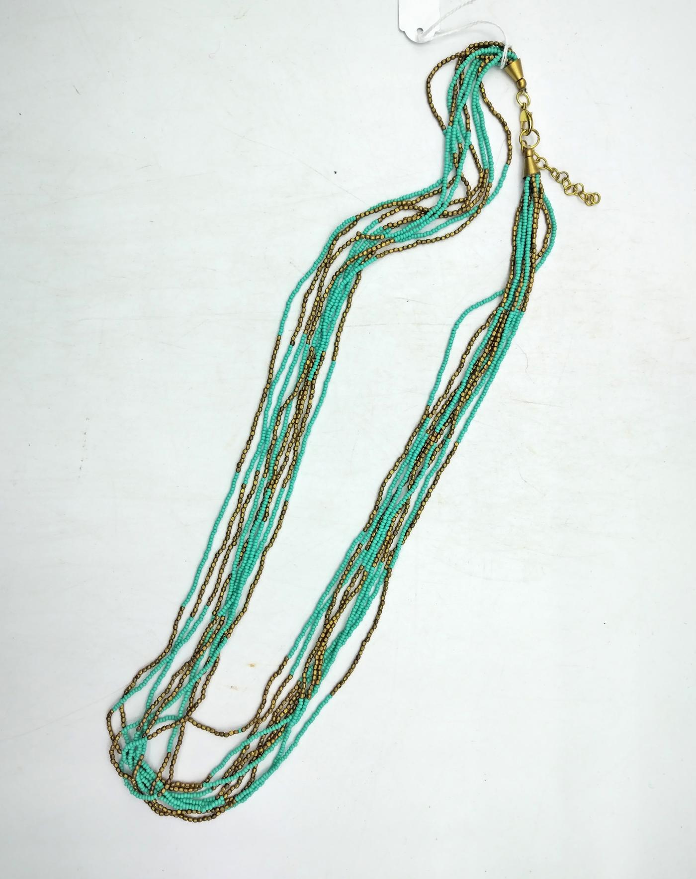 Collana lunga realizzata in India composta da più fili di perline piccole turchesi e dorate