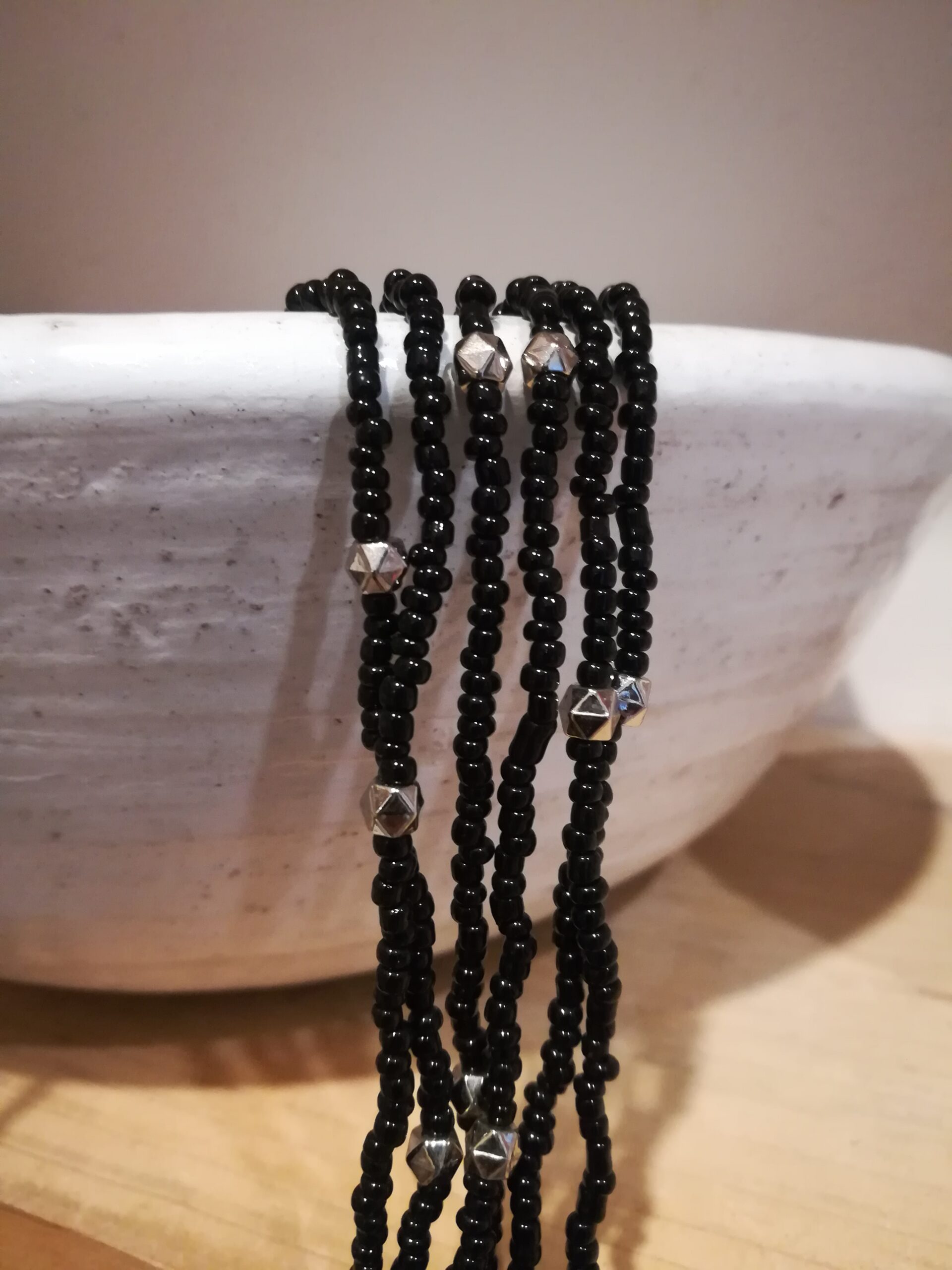 È composta da più fili di perline nere, eleganti e raffinate, che si intrecciano armoniosamente creando volume e movimento.