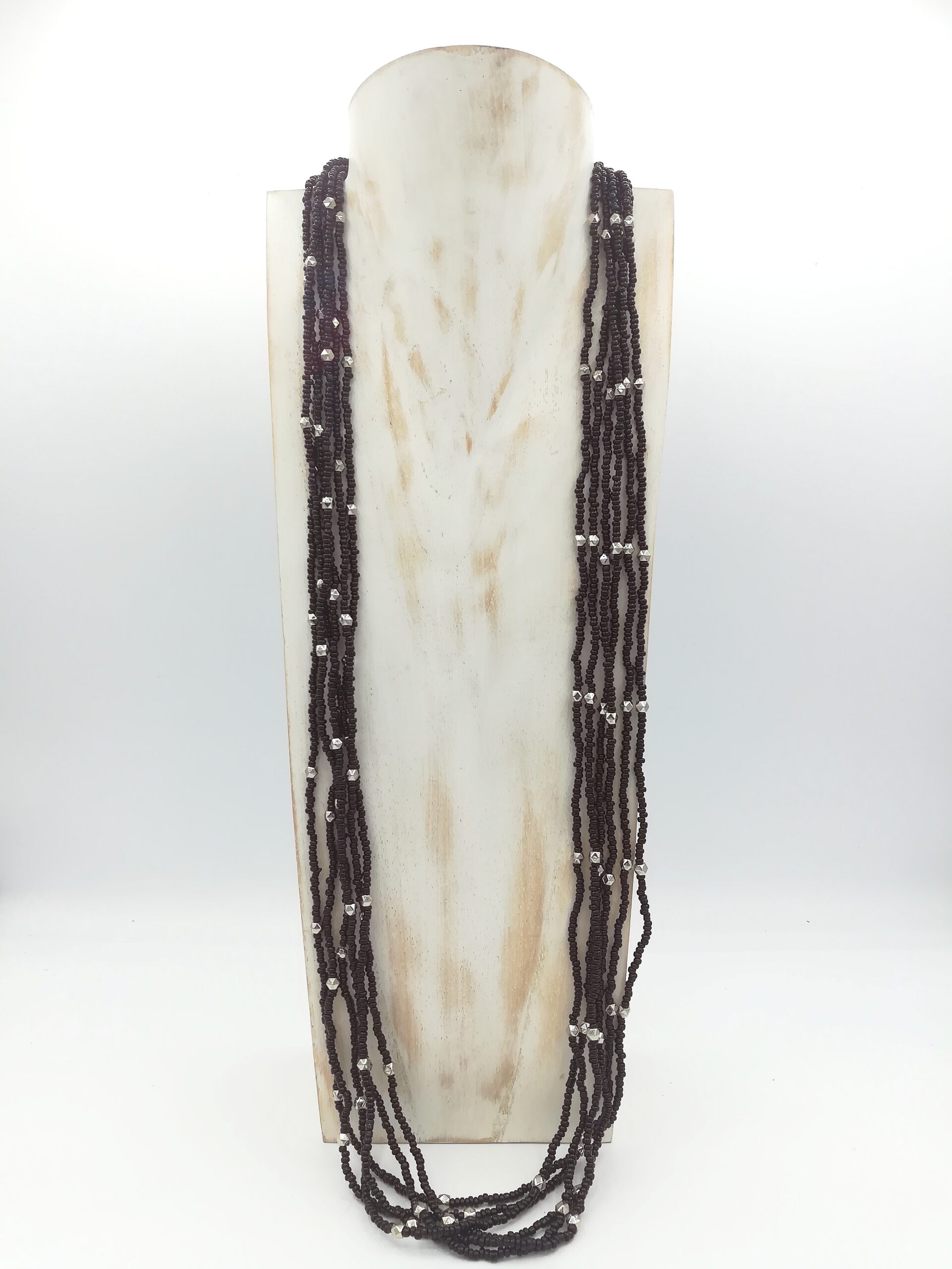 Collana Indonesiana Lunga a più fili di perline nere alternati con palline in metallo