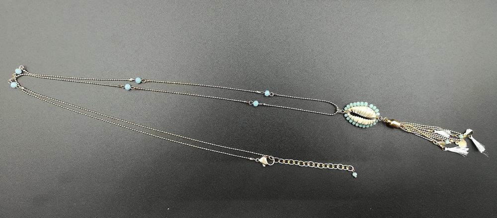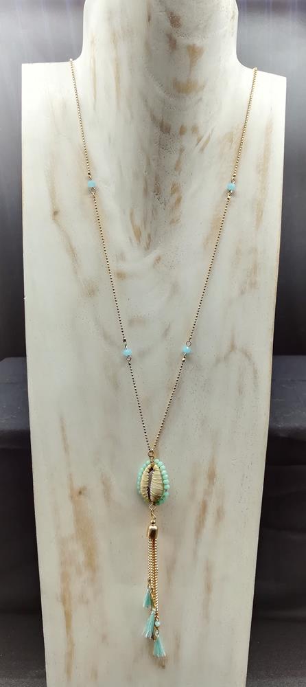 Collana lunga prodotta artigianalmente in India realizzata con perline e pendente con conchiglia e piccole nappe