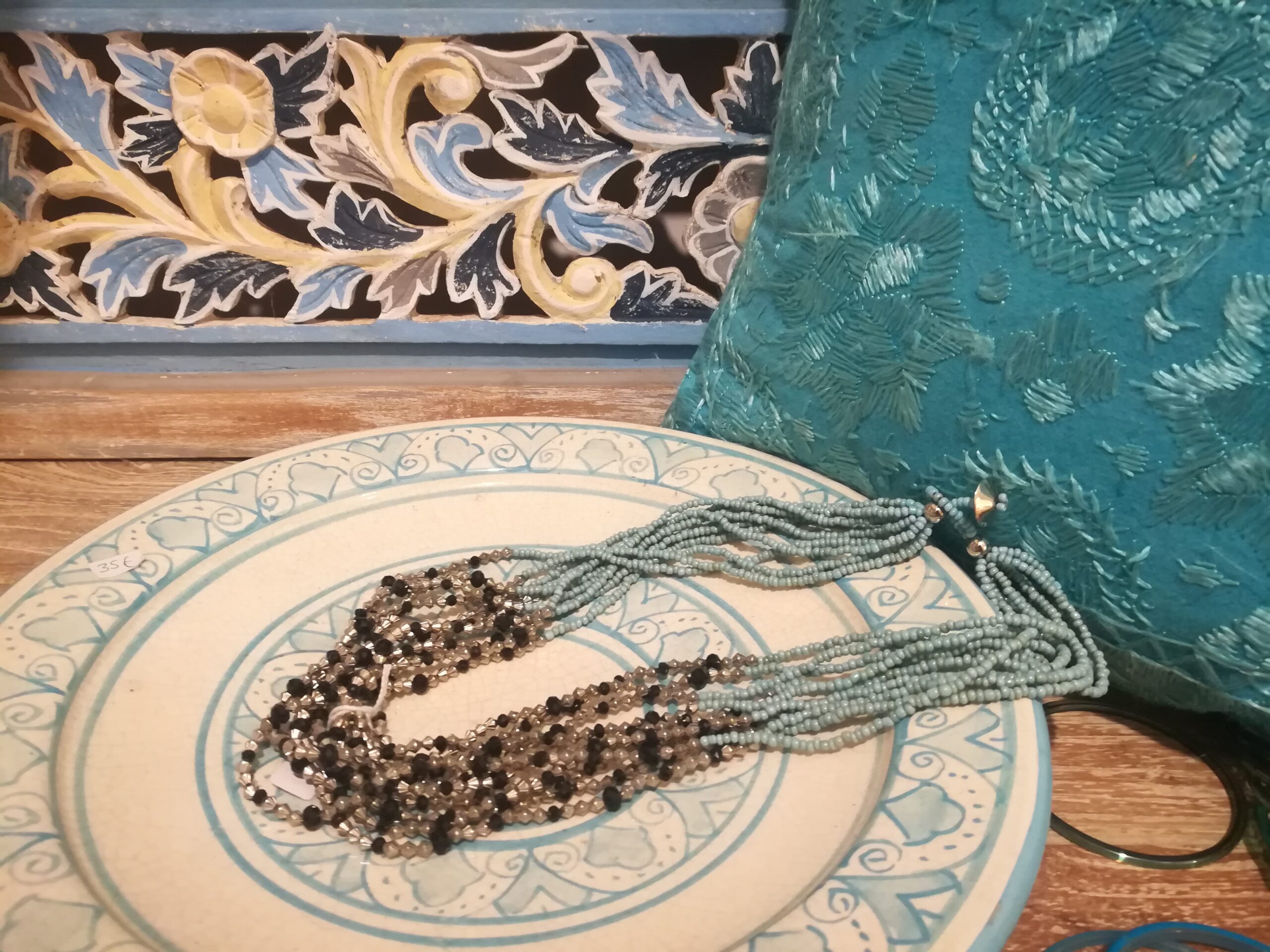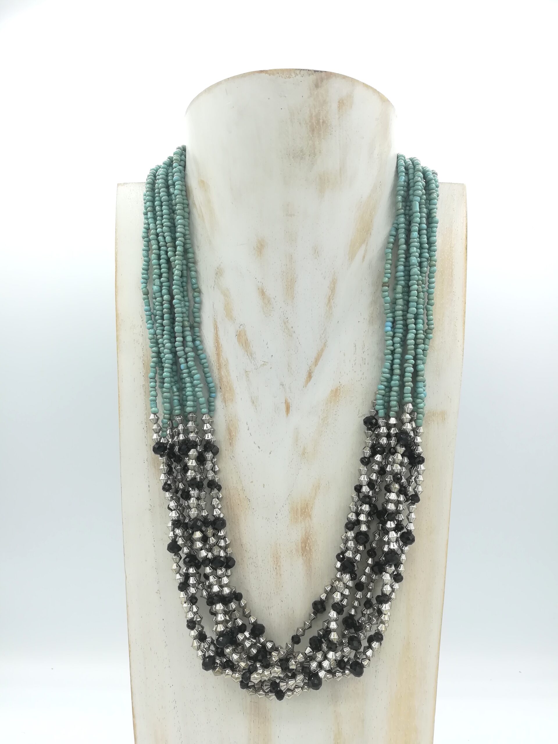 Collana indonesiana modello corto realizzata con perline piccole azzurre e perline irregolari nella parte centrale color nero e argento