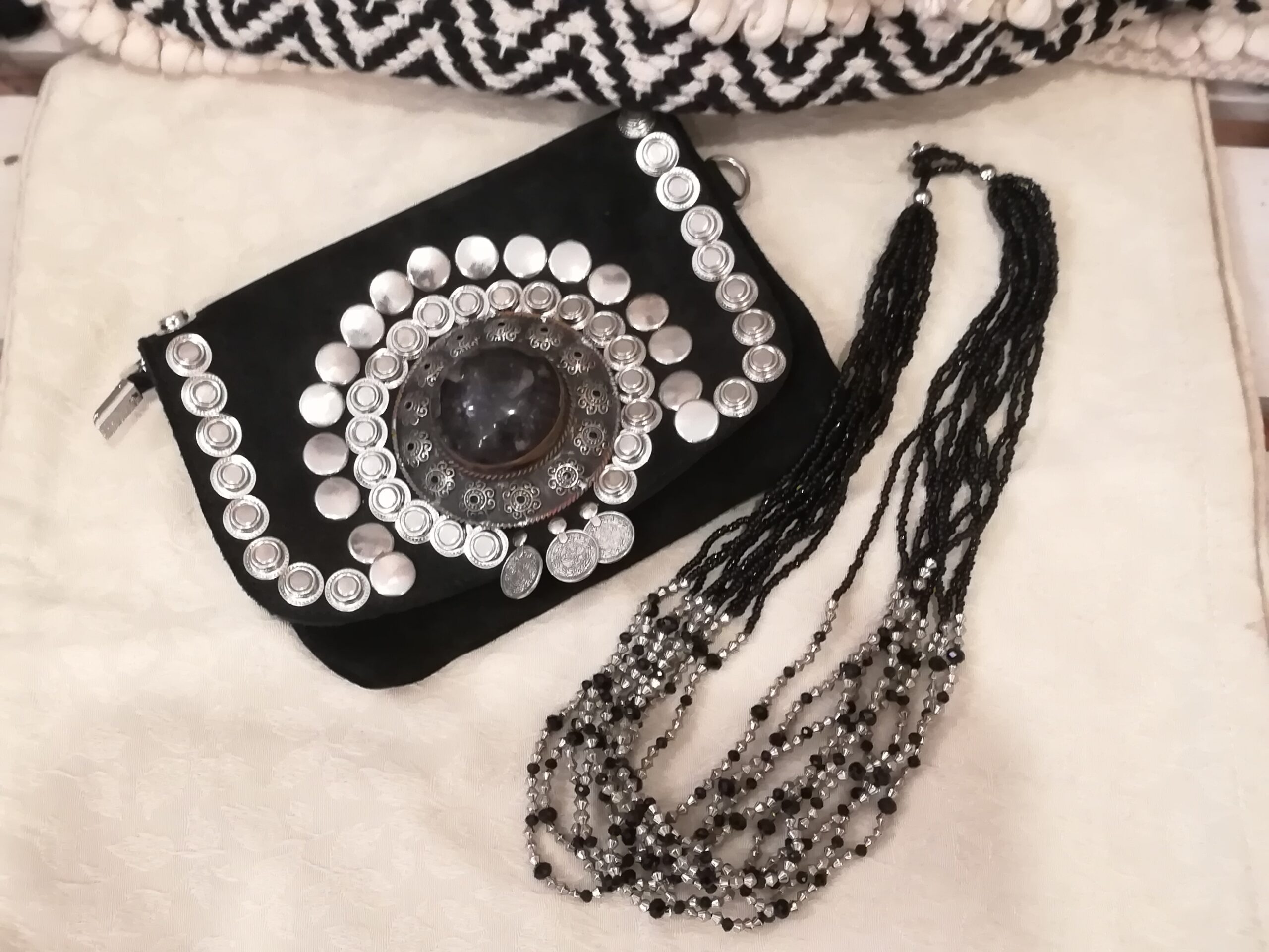 Collana indonesiana modello corto realizzata con perline piccole nere e perline irregolari nella parte centrale color nero e argento