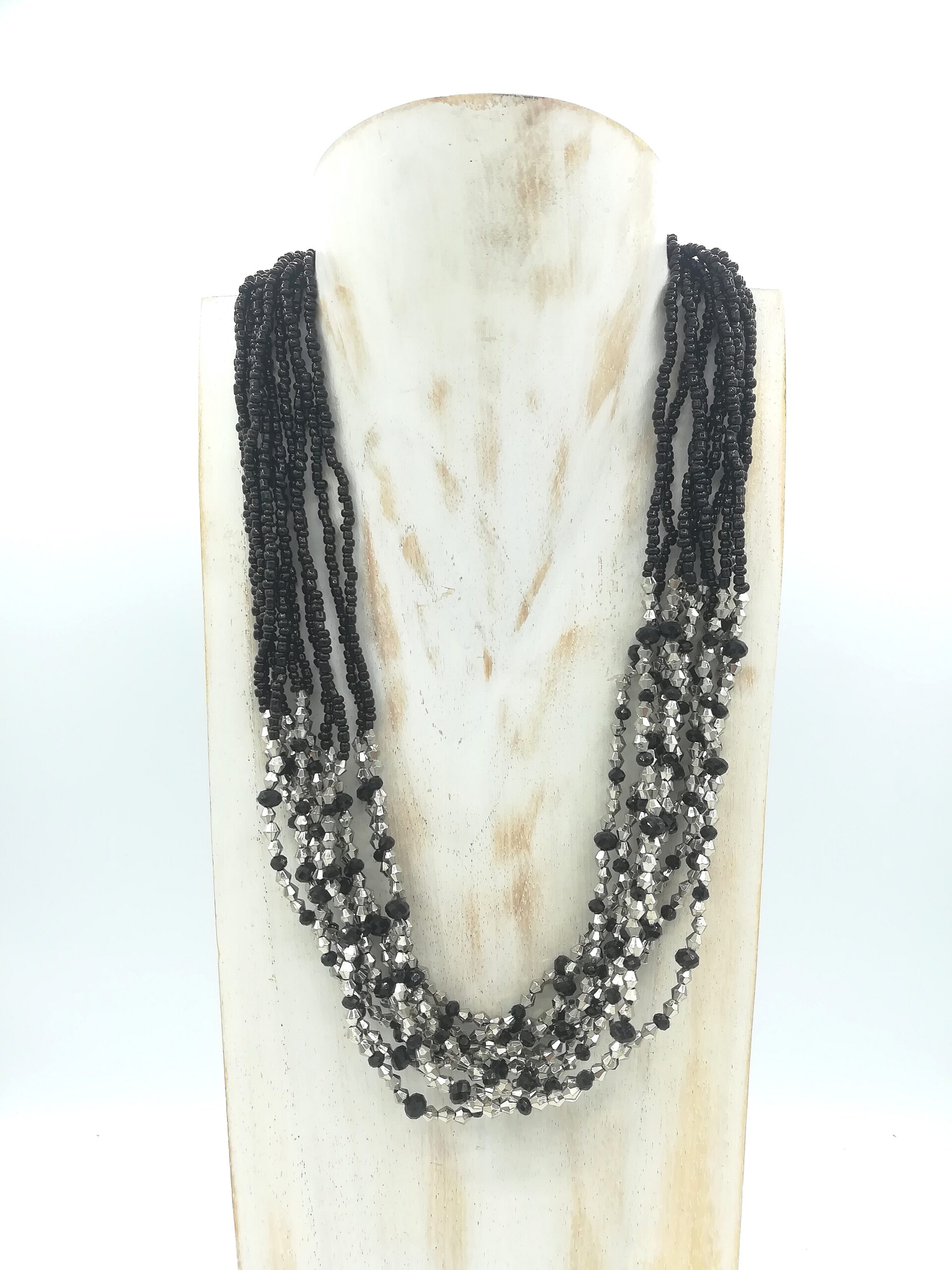 Questo modello corto a più fili composti da perline piccole nere, accuratamente lavorate e intrecciate per creare un effetto di profondità e fluidità.