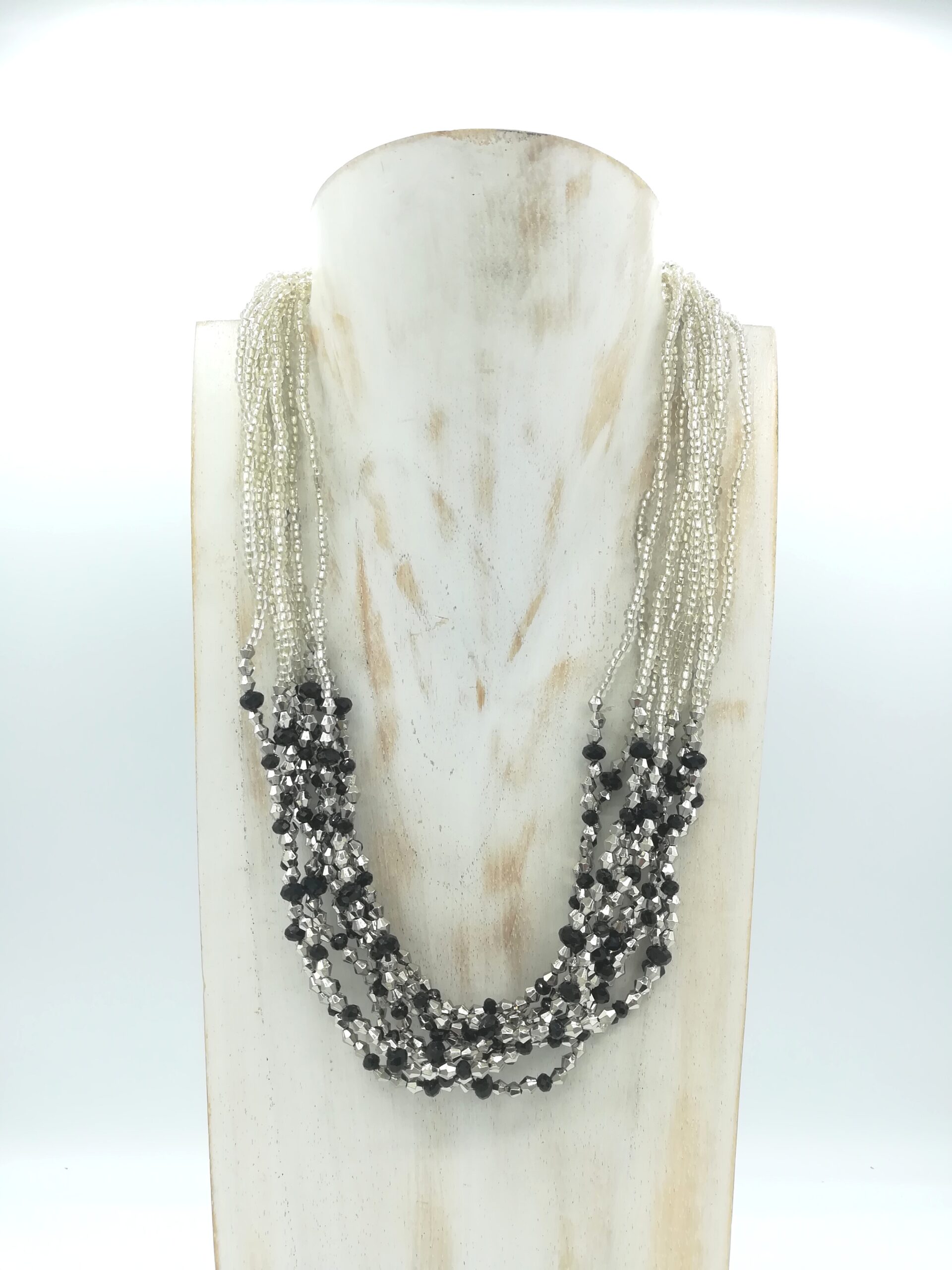 Al centro della collana, il design prende una svolta decisa e affascinante: perline irregolari nelle tonalità del nero e dell’argento aggiungono profondità e carattere al pezzo.