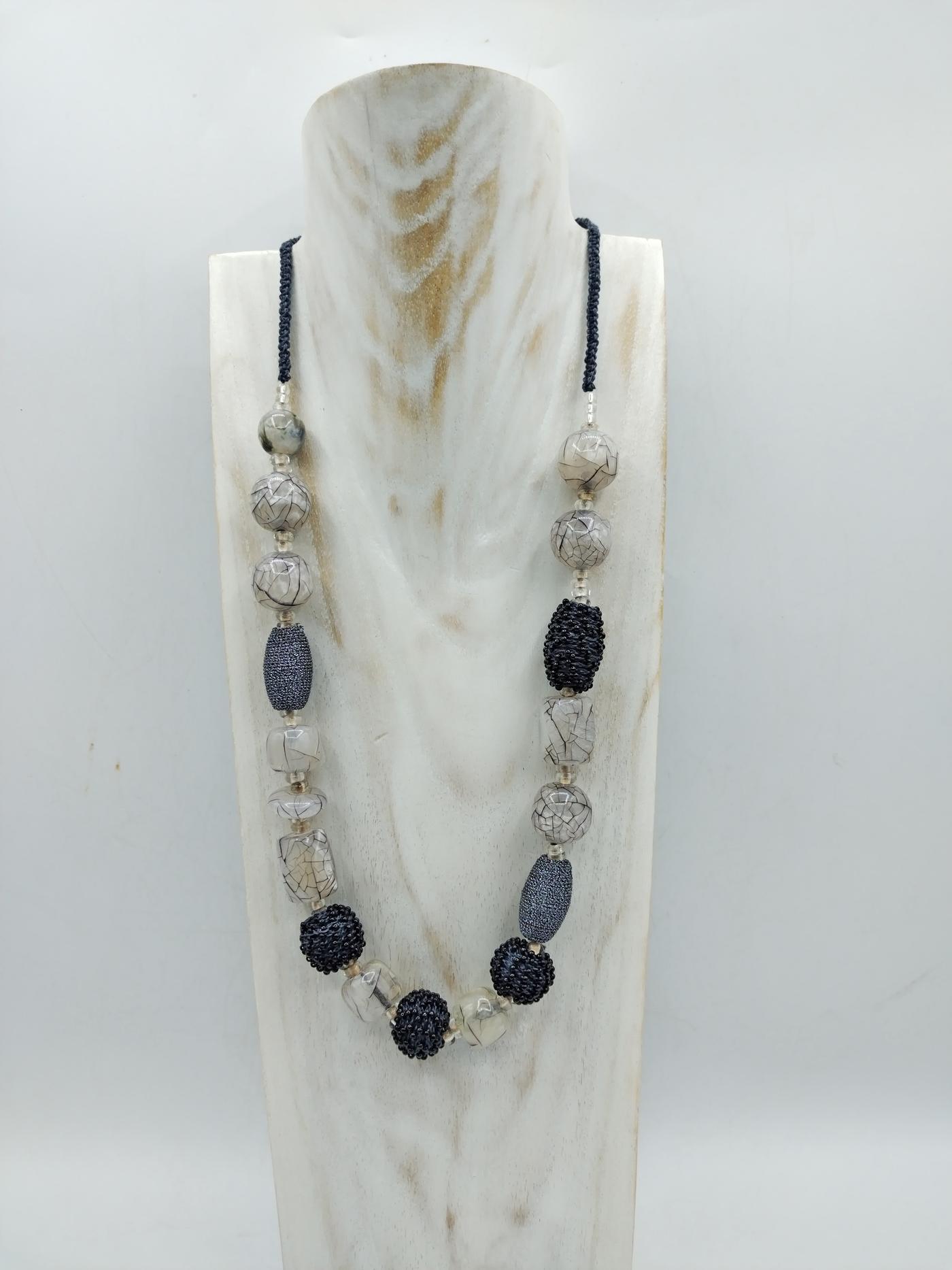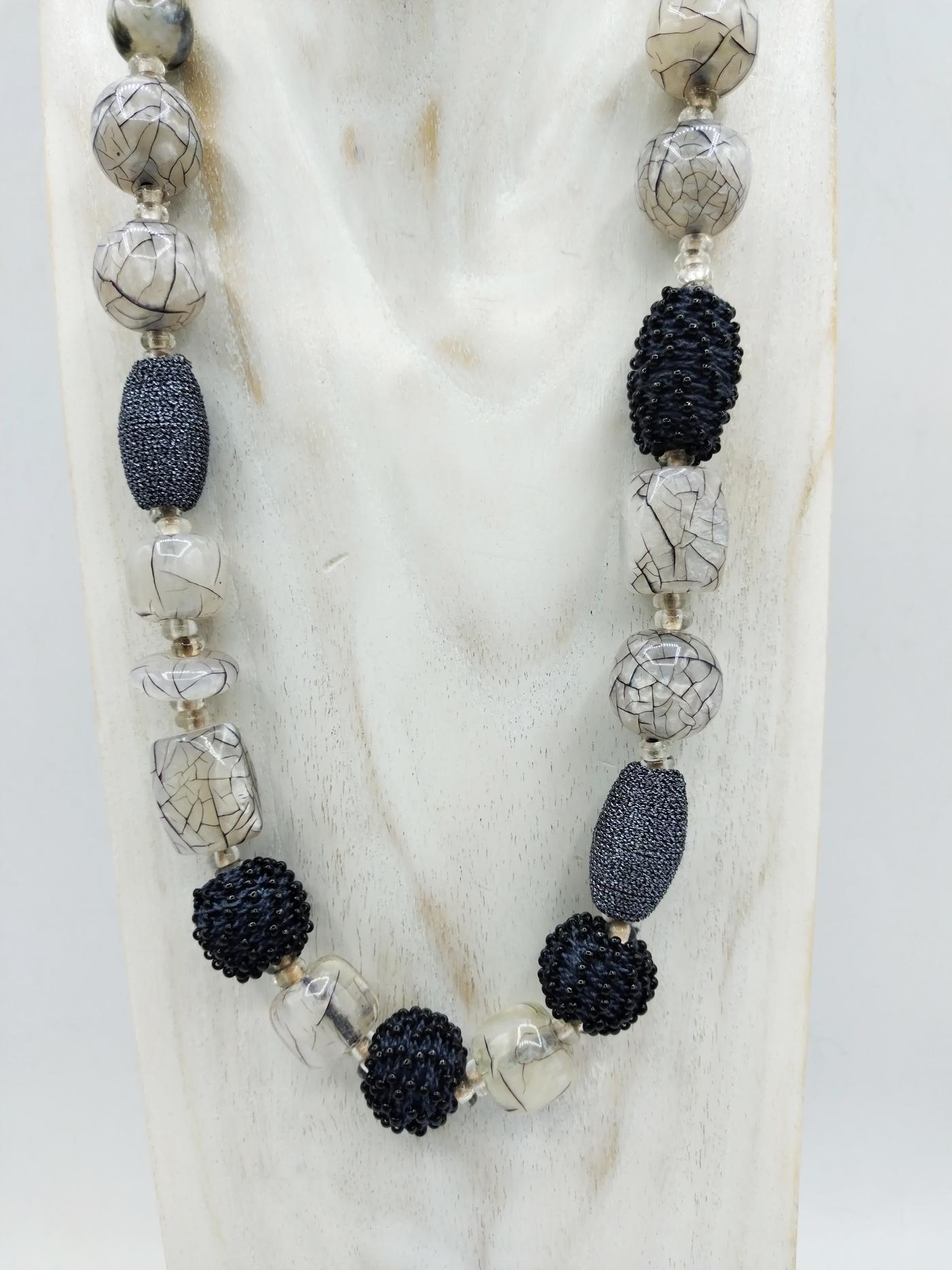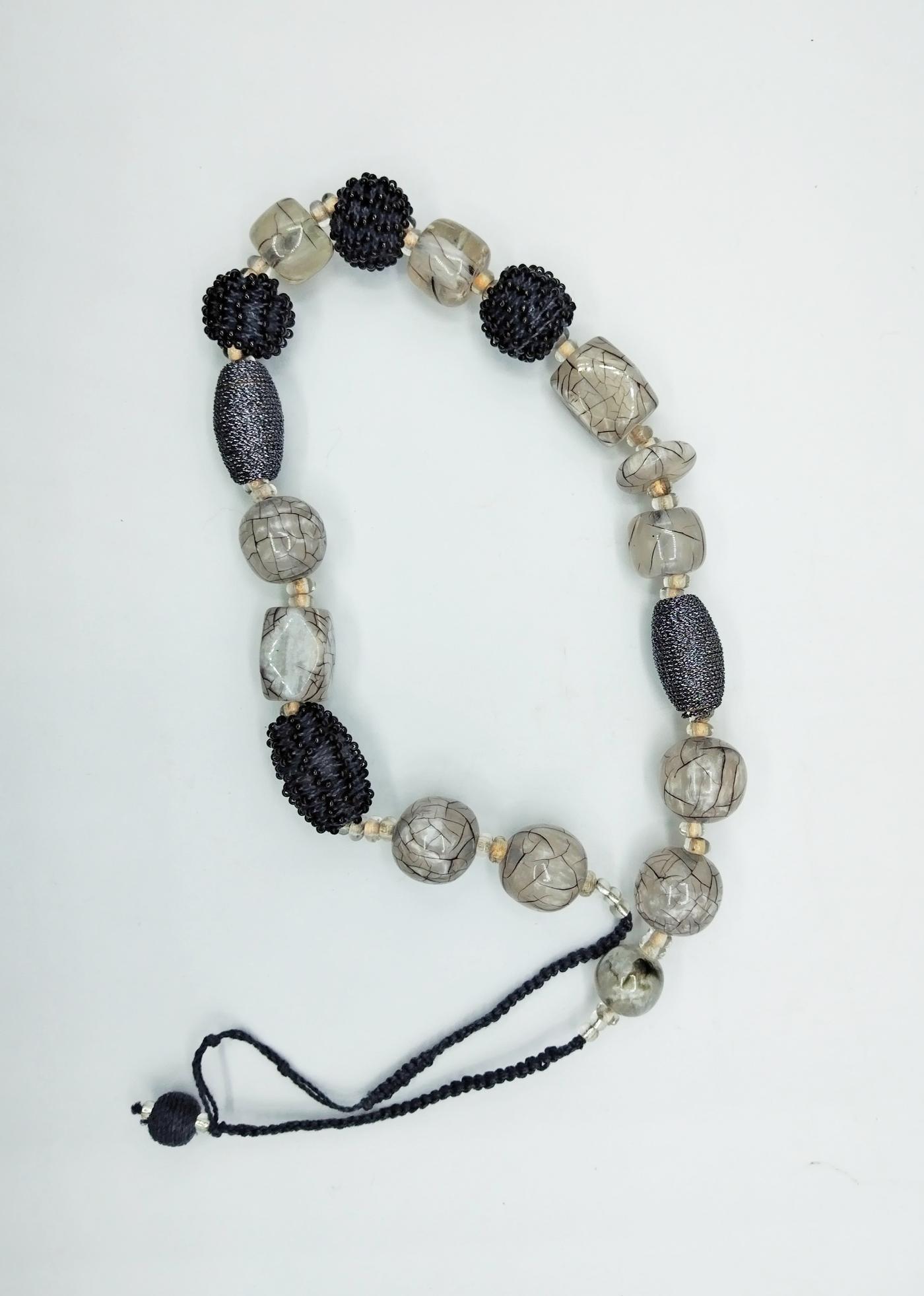 Le perline trasparenti si alternano armoniosamente a elementi ovali rivestiti a mano con filo di microperline sui toni del nero e del grigio antracite, creando un piacevole contrasto materico e cromatico. Ogni elemento è separato da piccole perline trasparenti, che alleggeriscono la composizione e ne esaltano l’equilibrio.