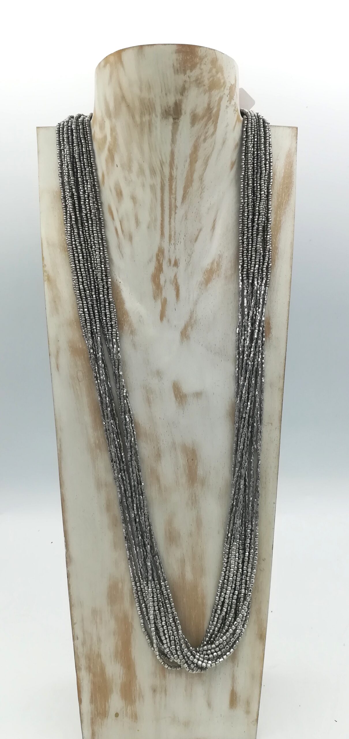 Collana indiana media lunga, realizzata con più fili di perline color argento