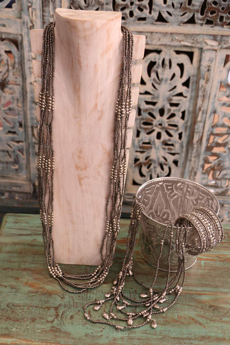 La Collana Joy è prodotta artigianalmente in Indonesia, realizzata a più fili di perline grigie ed in metallo argentato