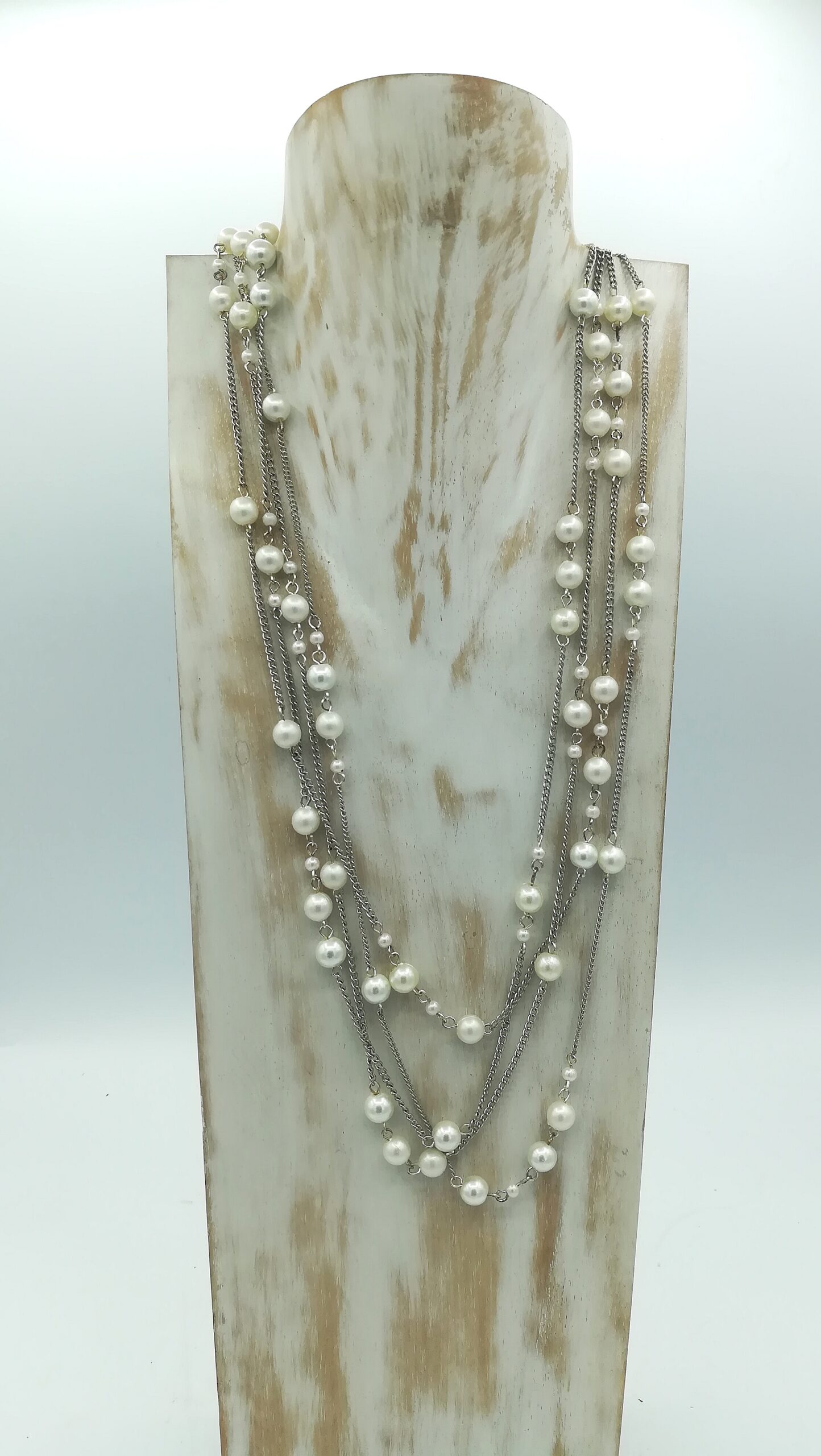 Collana realizzata in India con più fili in metallo e perle bianche di diverse dimensioni
