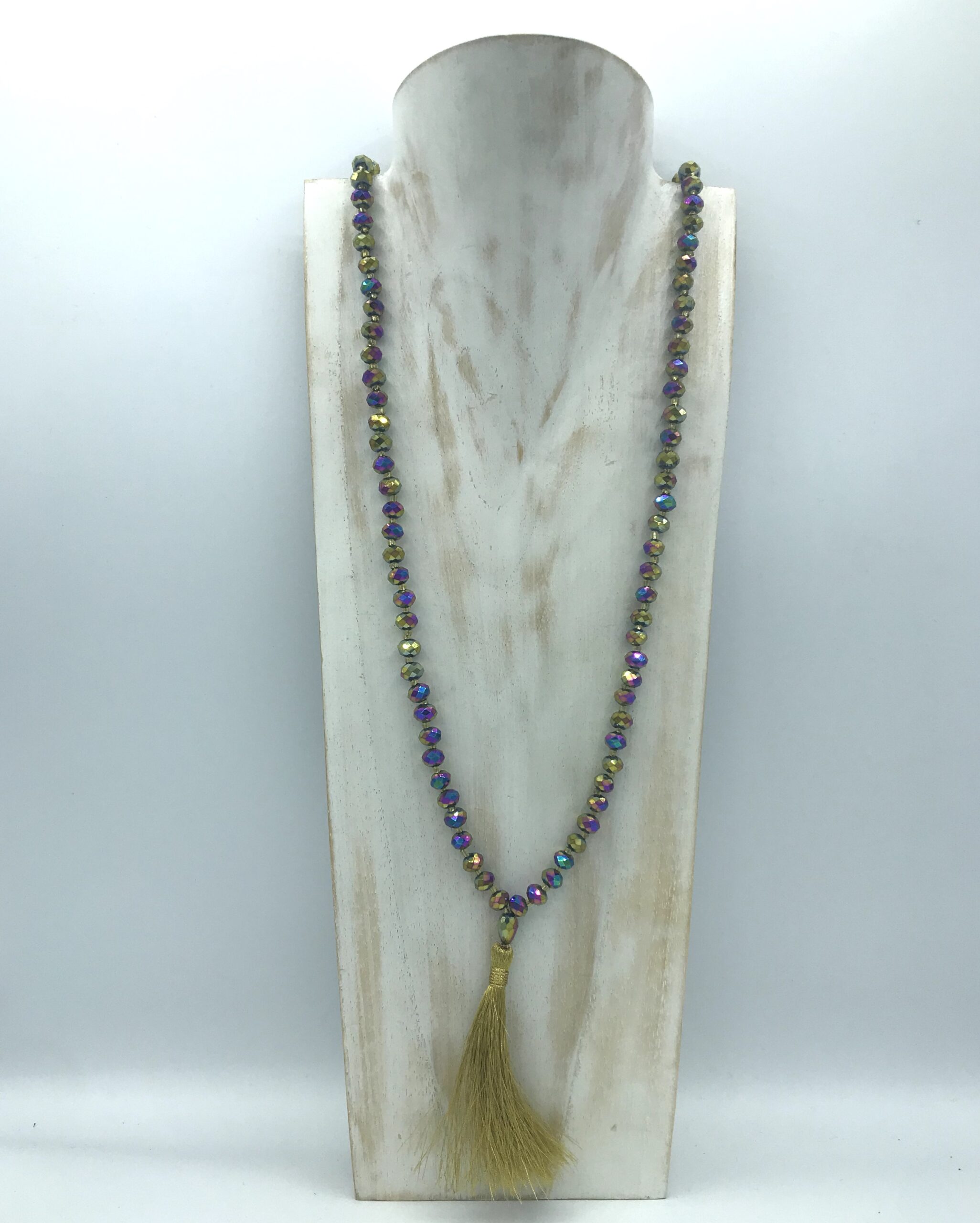 Collana lunga realizzata artigianalmente in Indonesia con Swarovski color arcobaleno e nappina in tessuto nella parte finale
