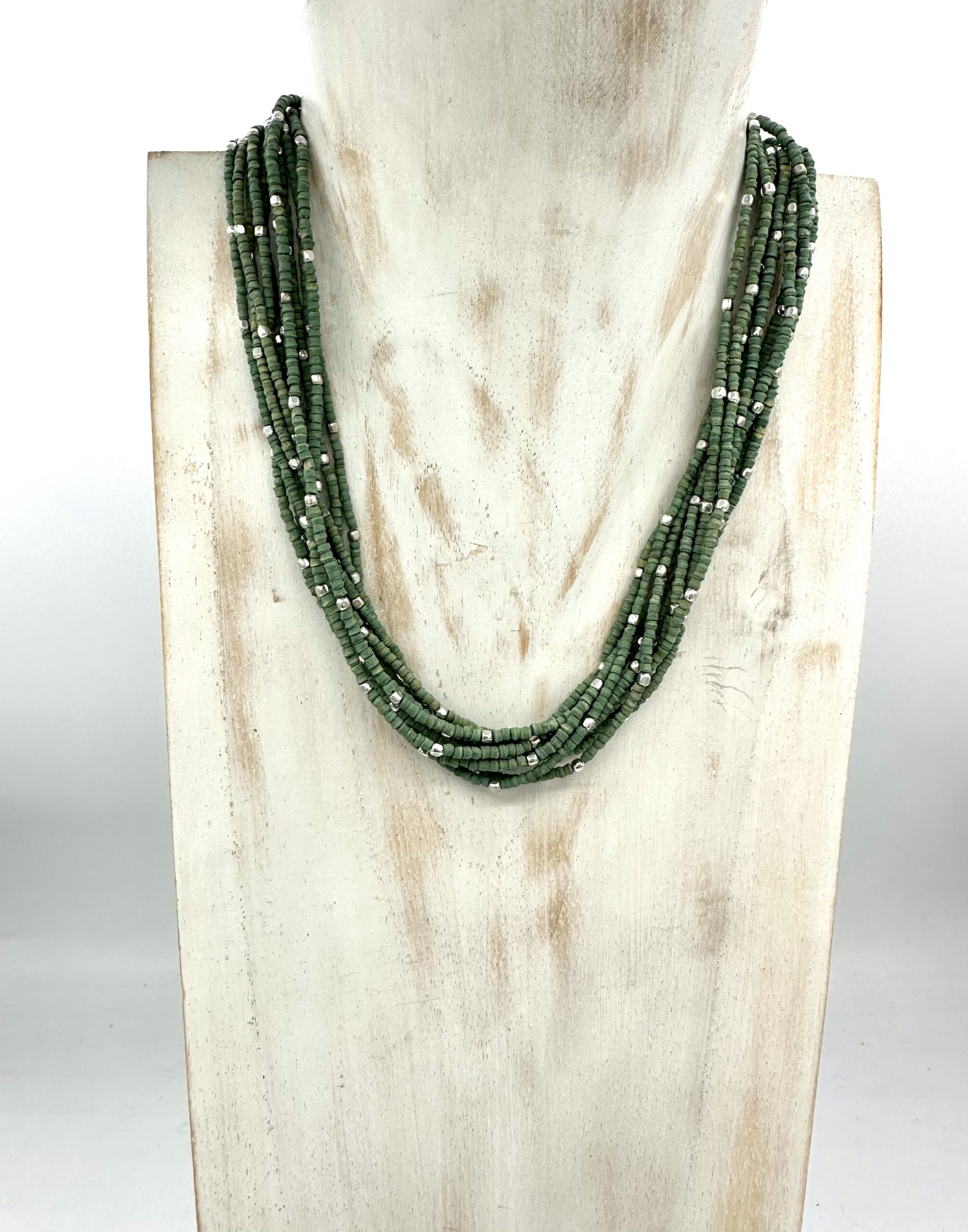 La sua struttura è composta da più fili di perline di color verde salvia, alternate con perline argentate che gli donano luminosità.