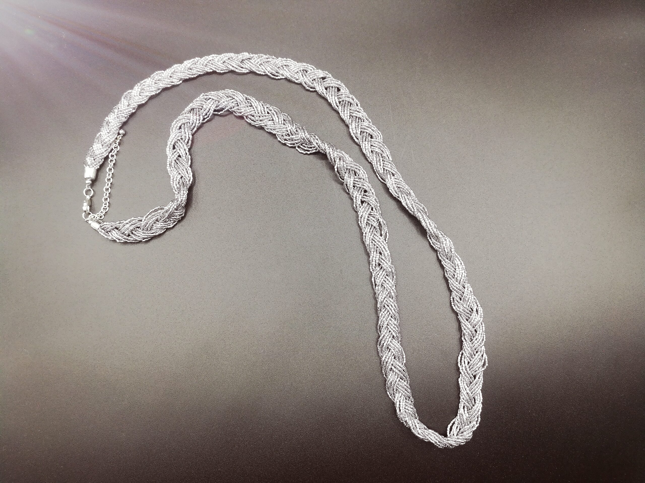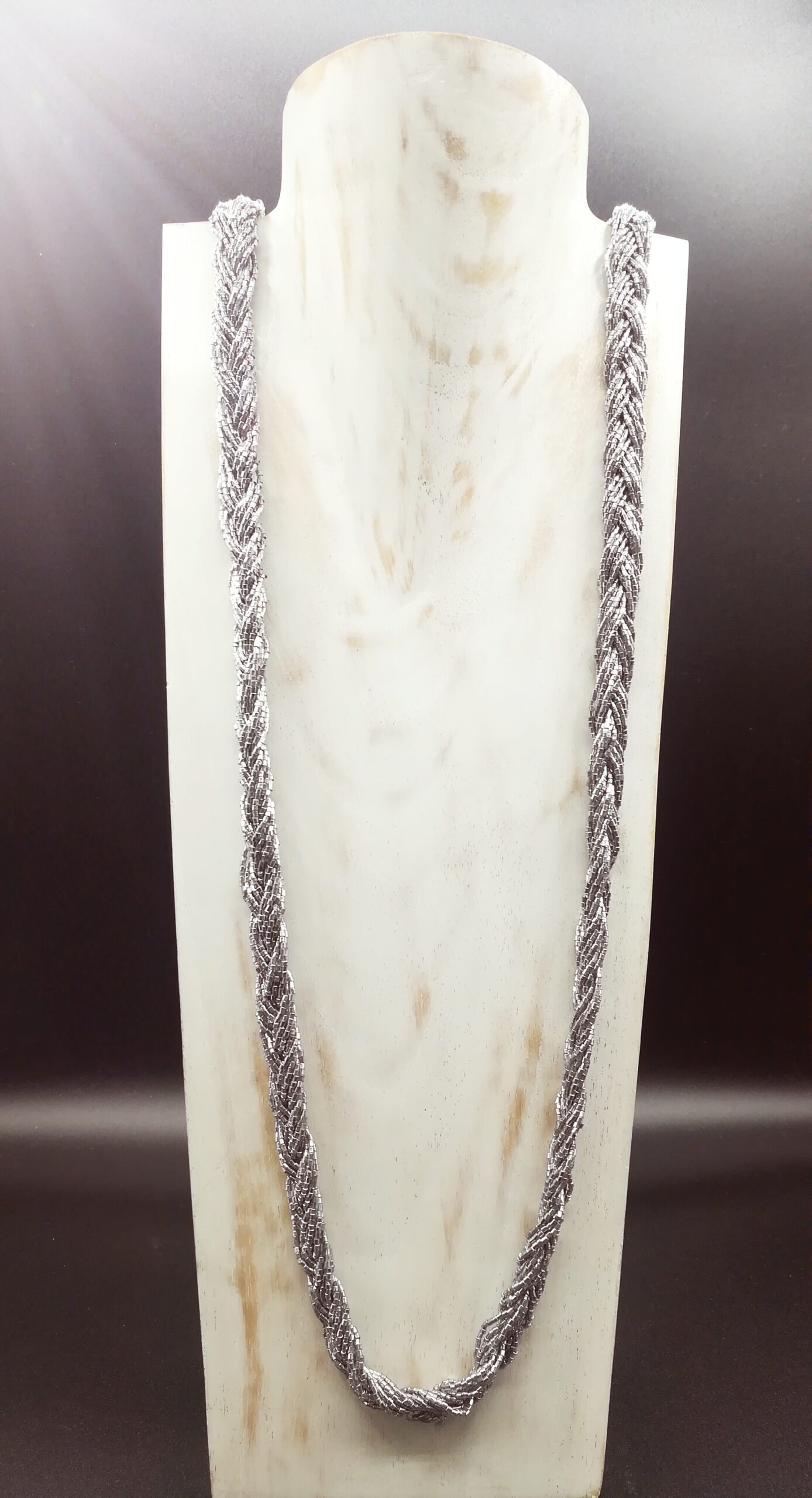 Collana lunga realizzata in India con fili di perline color argento intrecciate