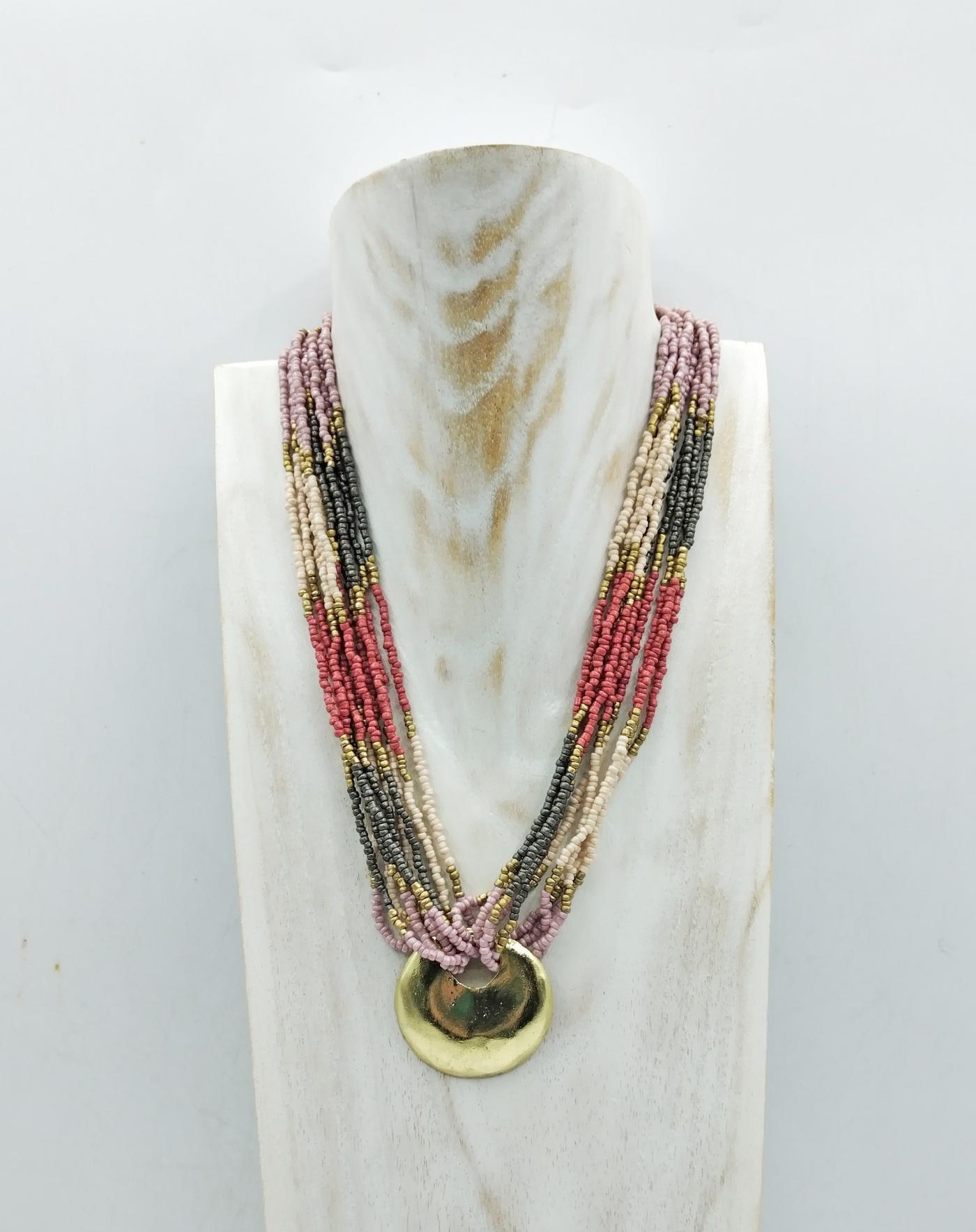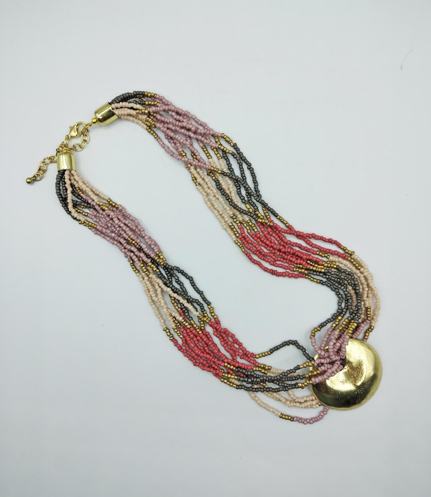 Collana realizzata artigianalmente in India, composta da più fili di perline dalla sfumatura rosa scuro, oro, viola e rosa chiaro, con pendente dorato centrale