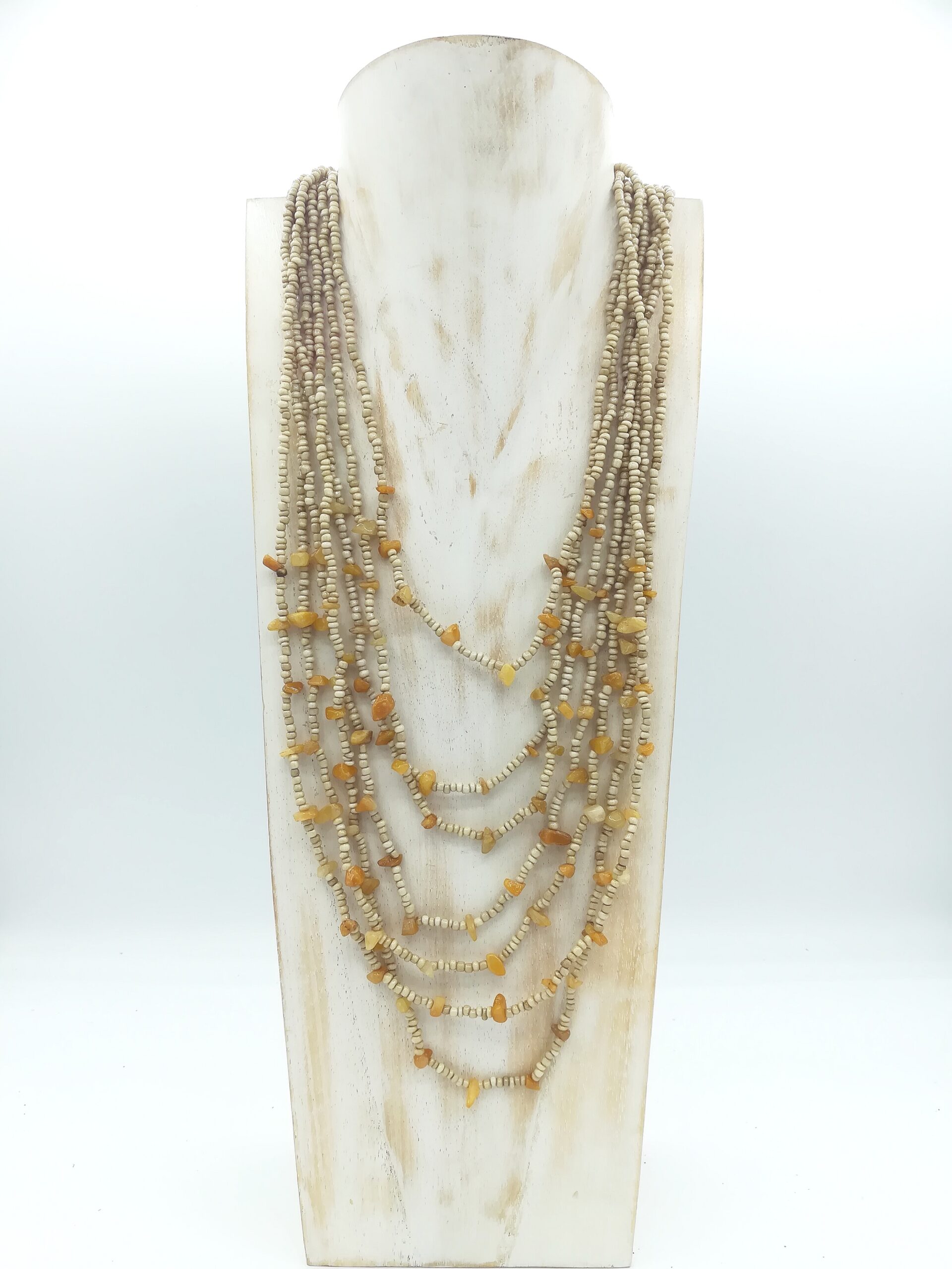 Collana lunga realizzata in Indonesia con perline beige e piccole pietre