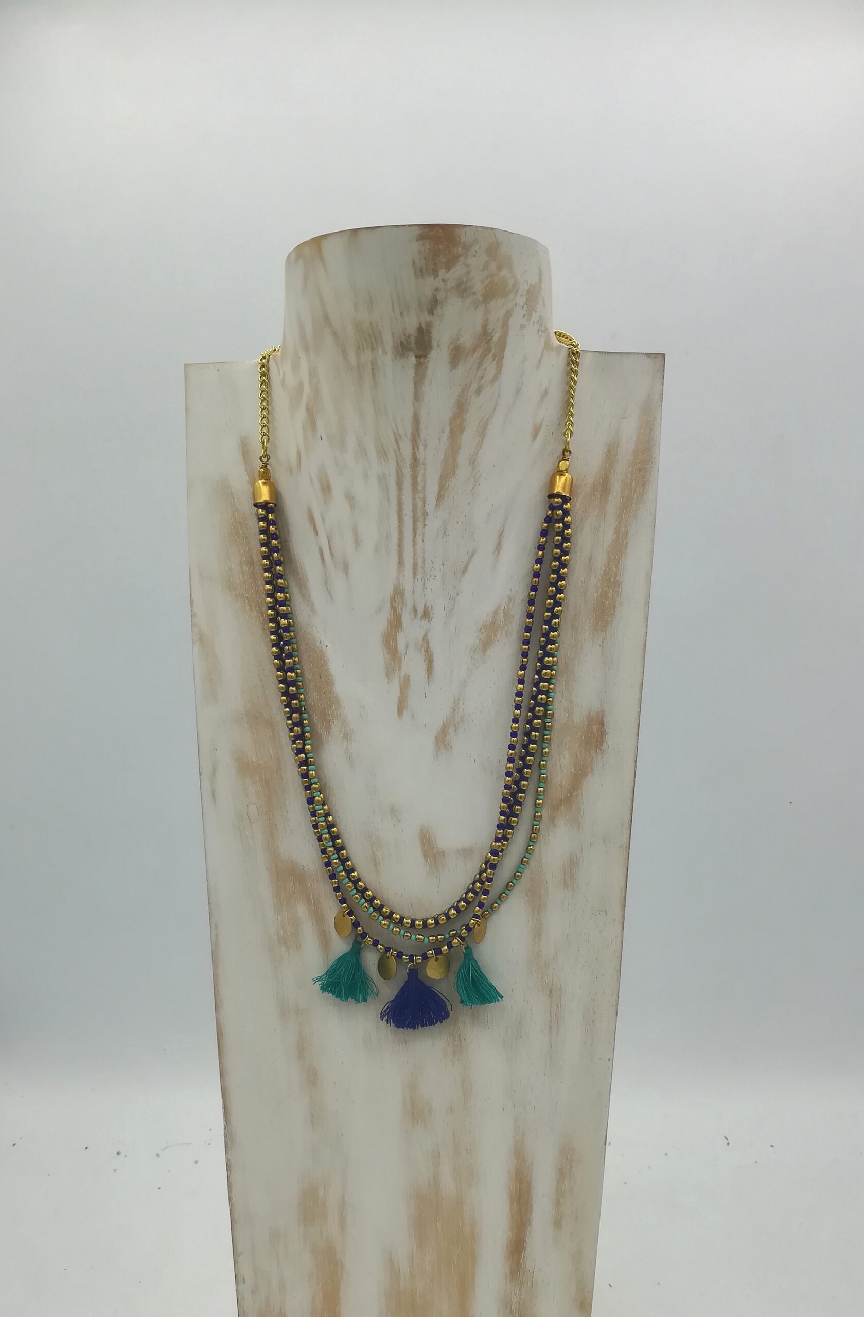 I pendenti dorati aggiungono un tocco sofisticato, mentre le nappine colorate regalano movimento e una nota giocosa, rendendo la collana Saad perfetta per chi ama distinguersi con originalità.