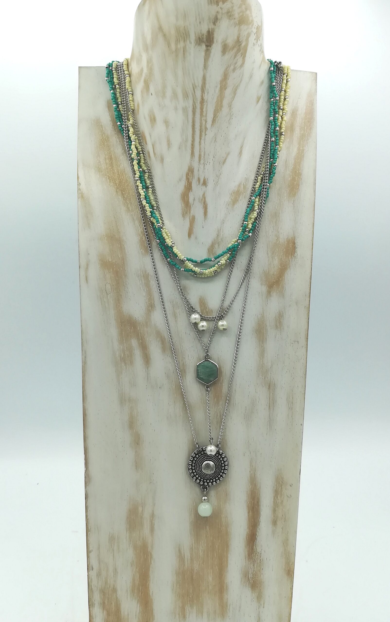 I fili in metallo argentato creano un effetto lucente e armonioso e sono accostati a fili più corti di perline turchesi e bianche aggiungono un tocco di colore, mentre i pendenti centrali di pietre e perle, di forme e dimensioni differenti, danno movimento e originalità, rendendo la collana unica e versatile.